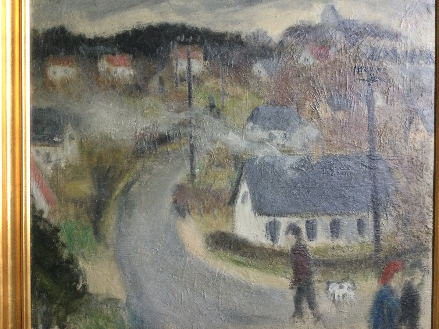Maleri af Marie Vandmose - Vej gennem by med personer.