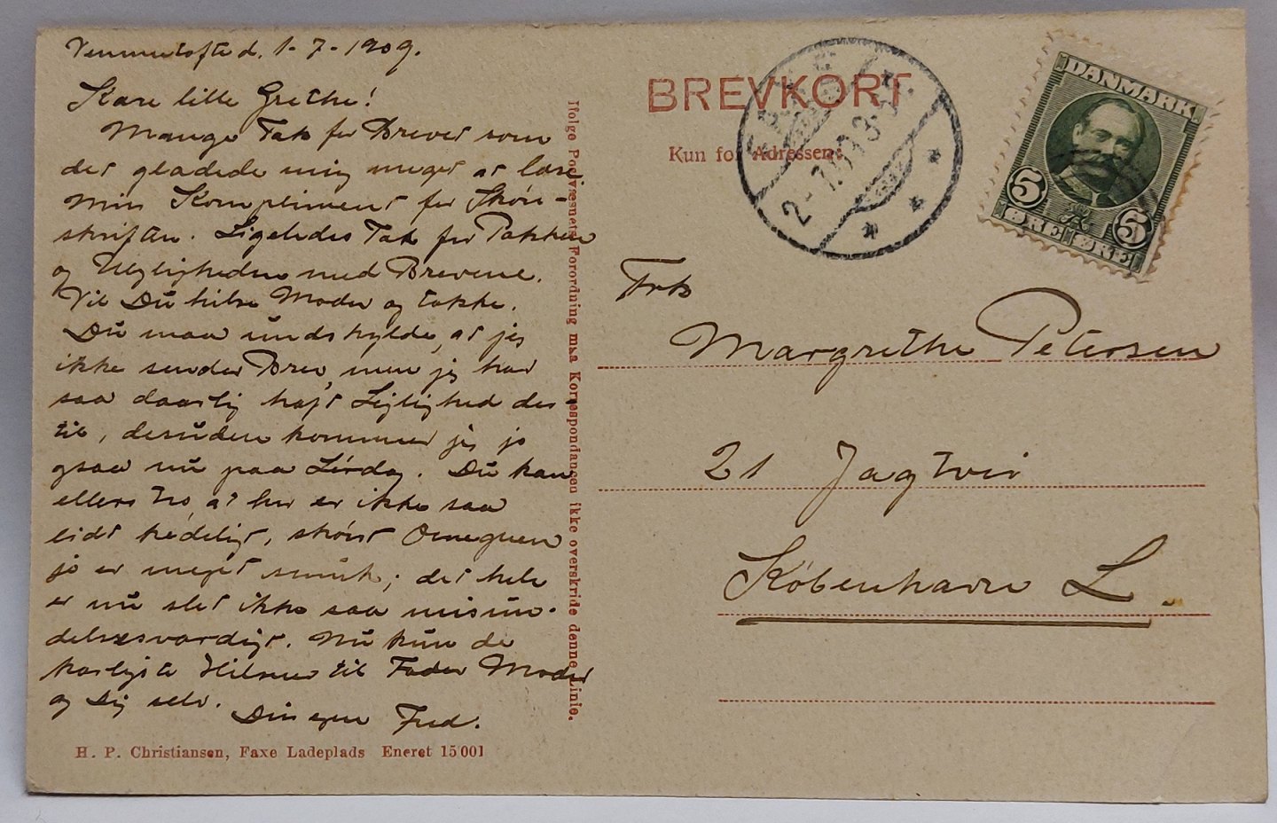 Postkort: Gademotiv fra Faxe Ladeplads. Annulleret FAXE i 1909. I god stand