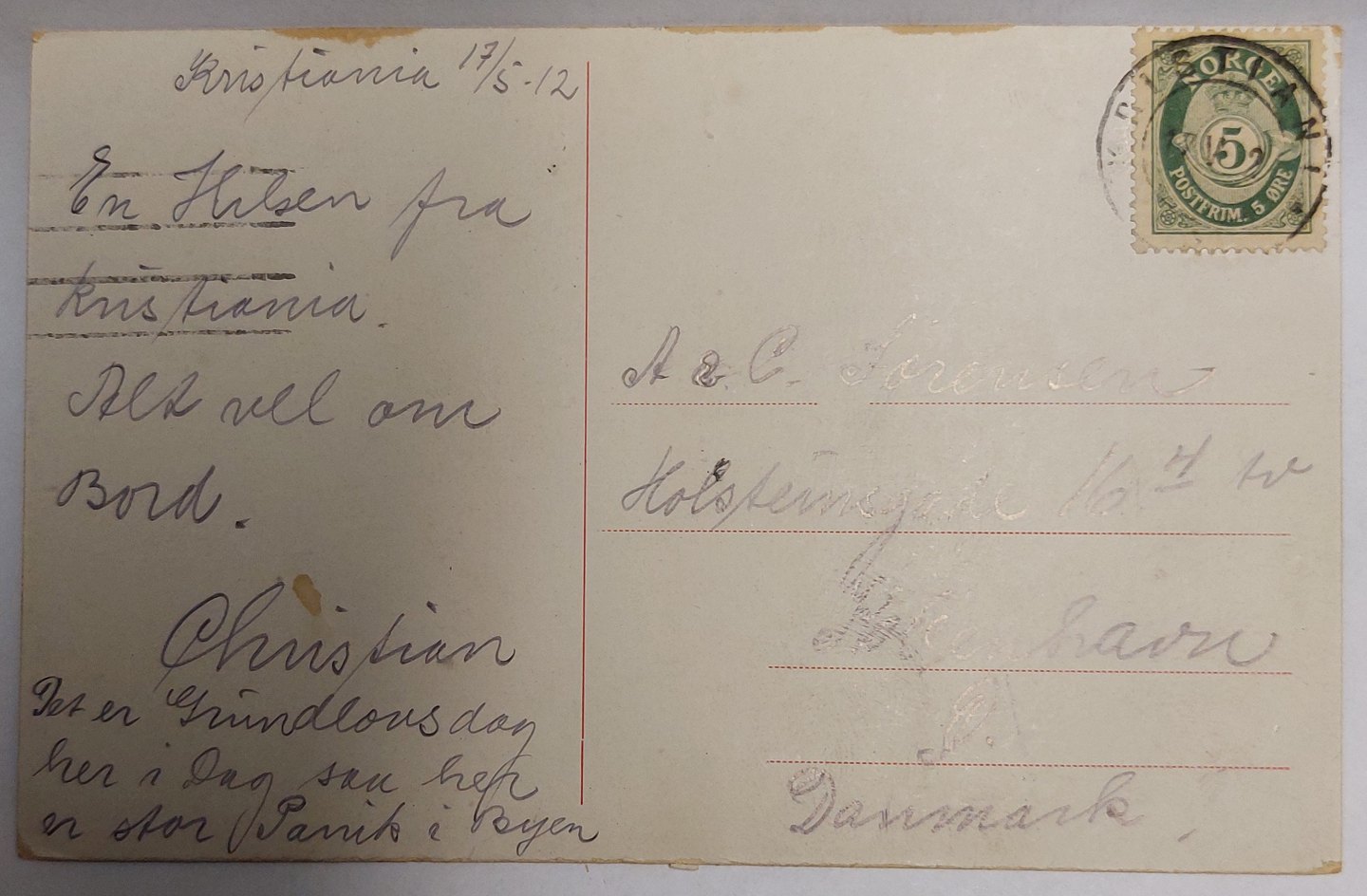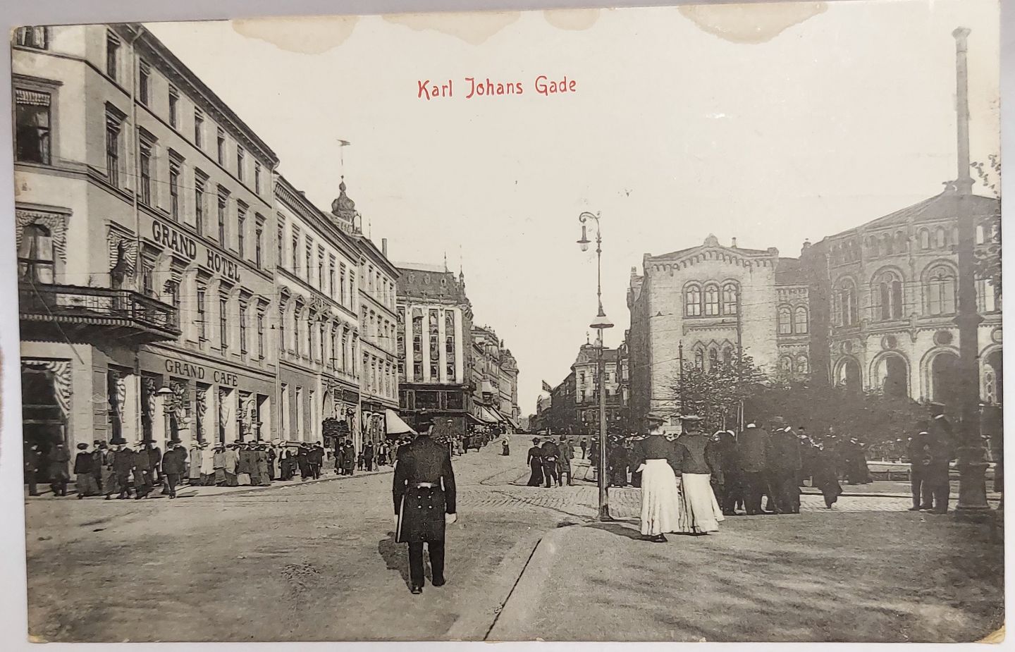 Postkort: Motiv med liv på Karl Johan, Kristiania/Oslo, Norge i 1912. Lidt pletter øverst eller i orden.