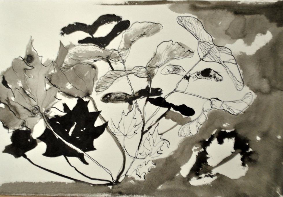 Degett, Karen (1954 - 2011) Denmark: Maple leaves and seeds in black and white. Watercolor and ink on paper. Unsigned. Unframed. 27 x 39.5 cm.