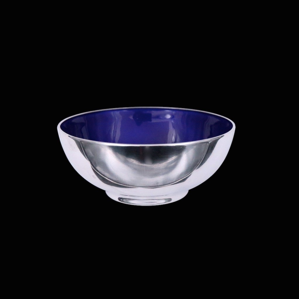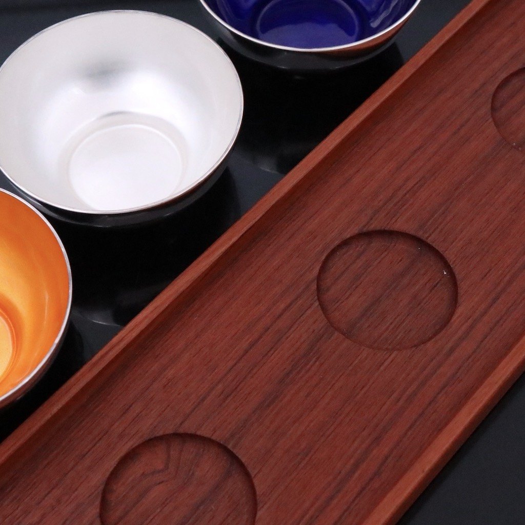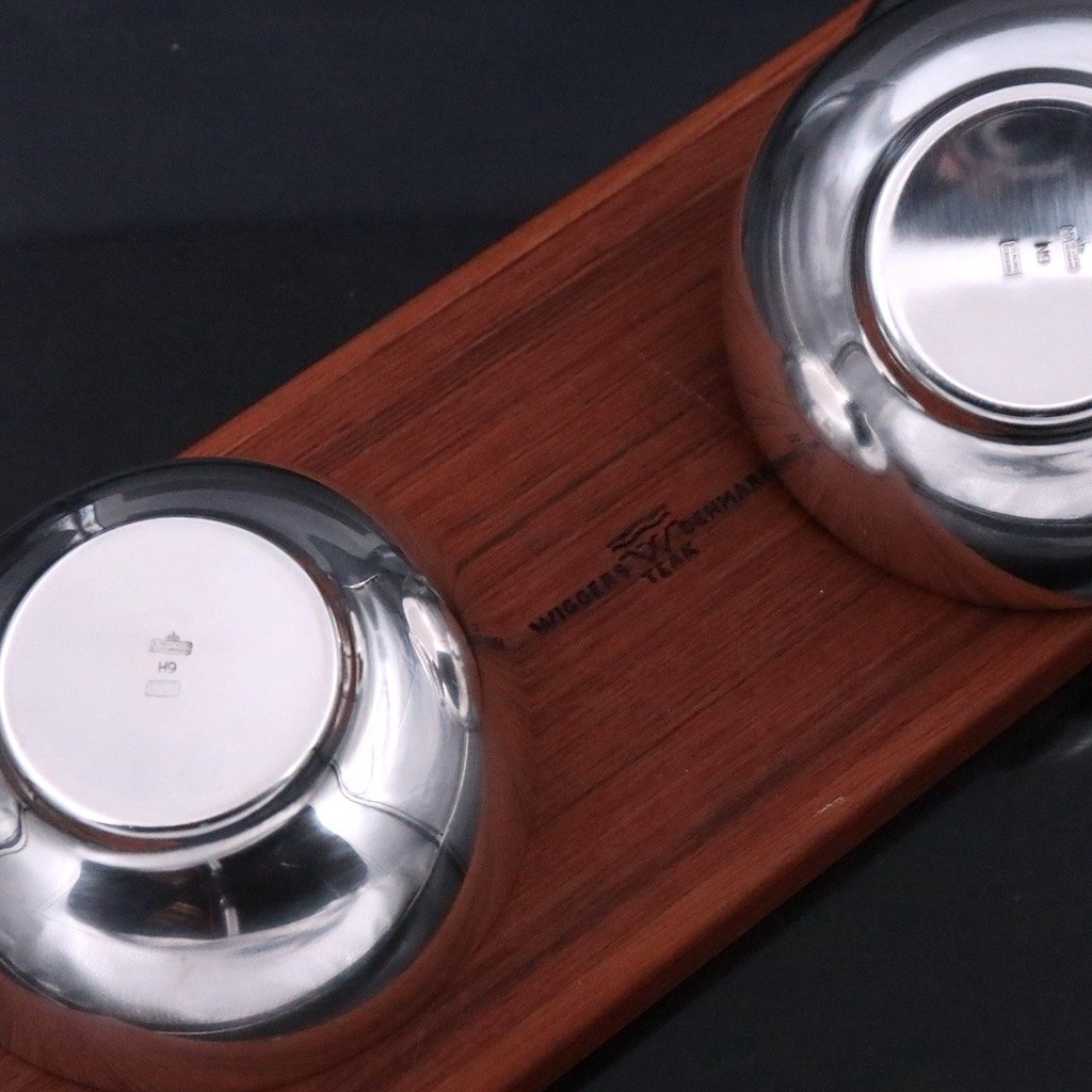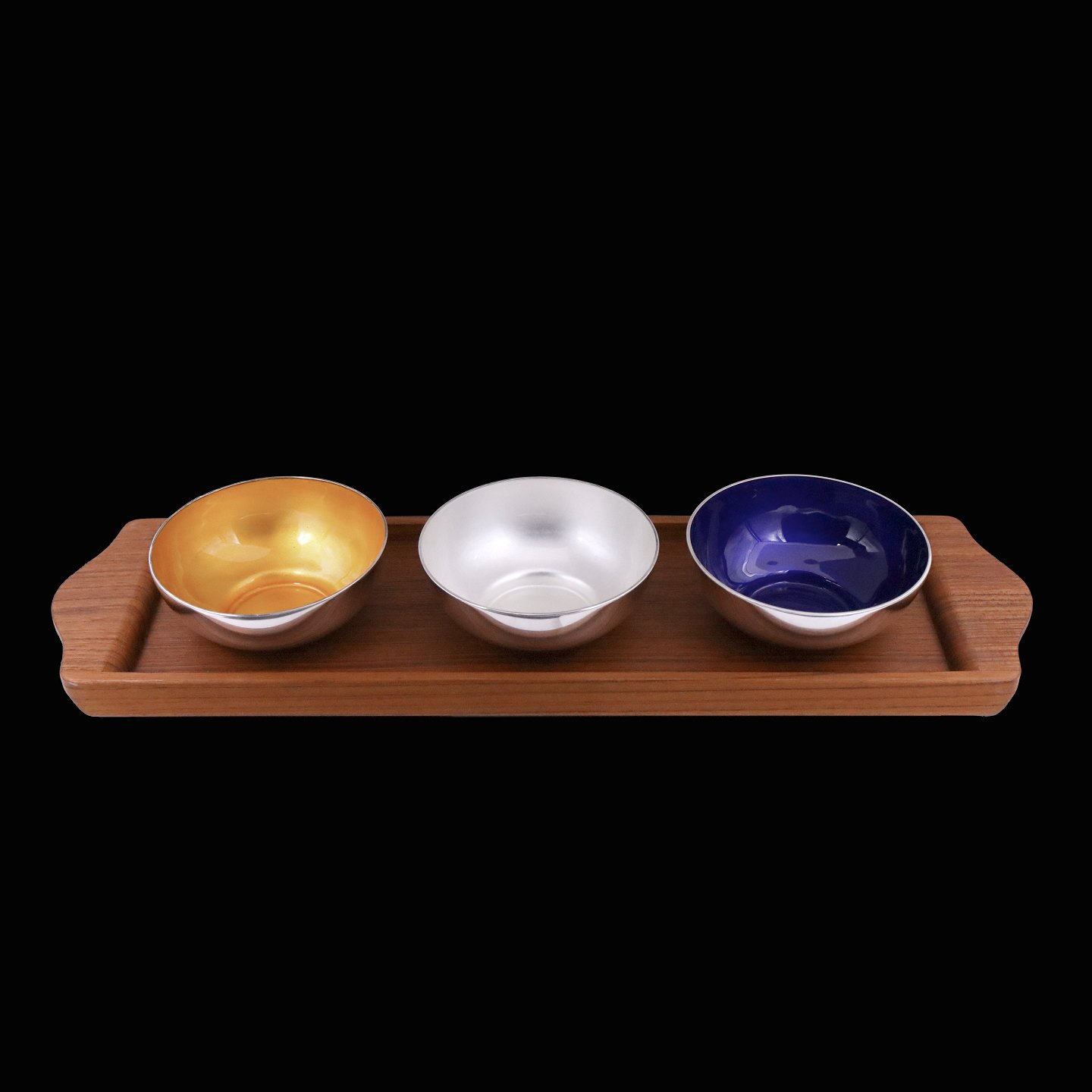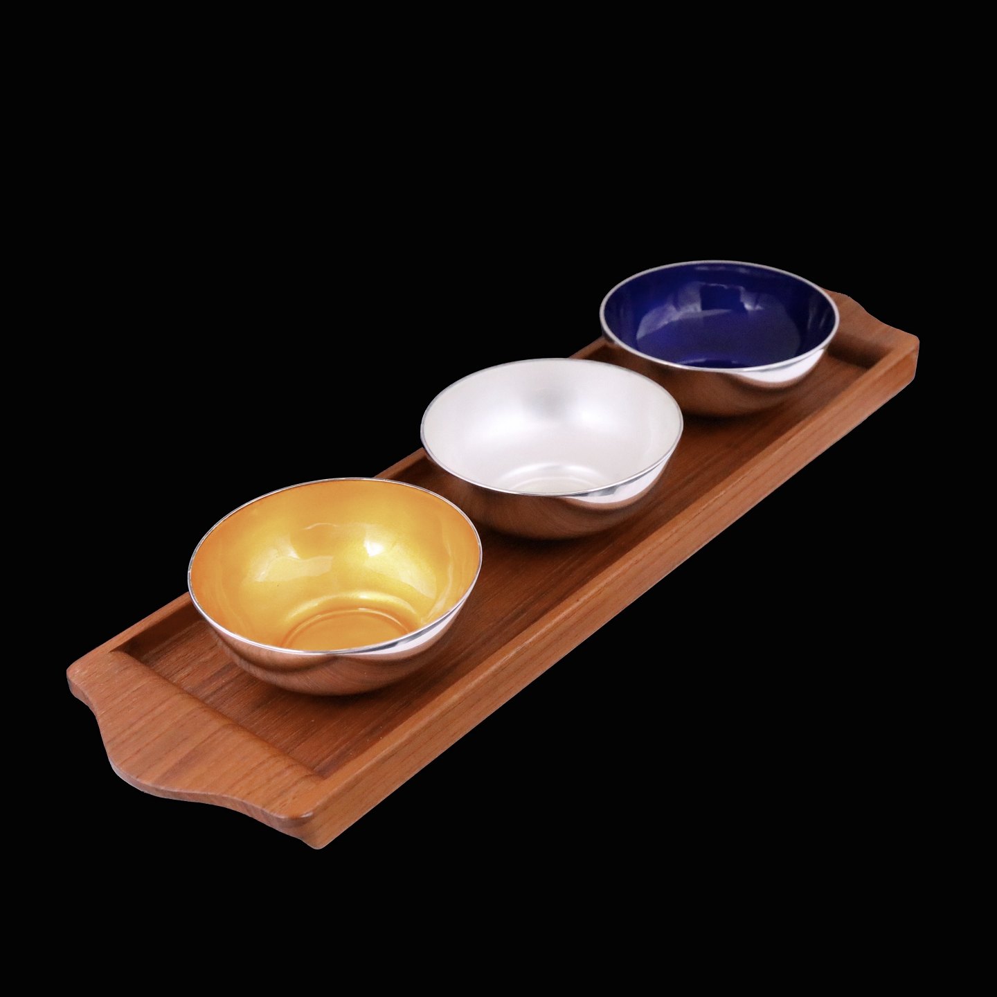 A. Michelsen. Sæt på tre skåle med emalje på teakbræt.