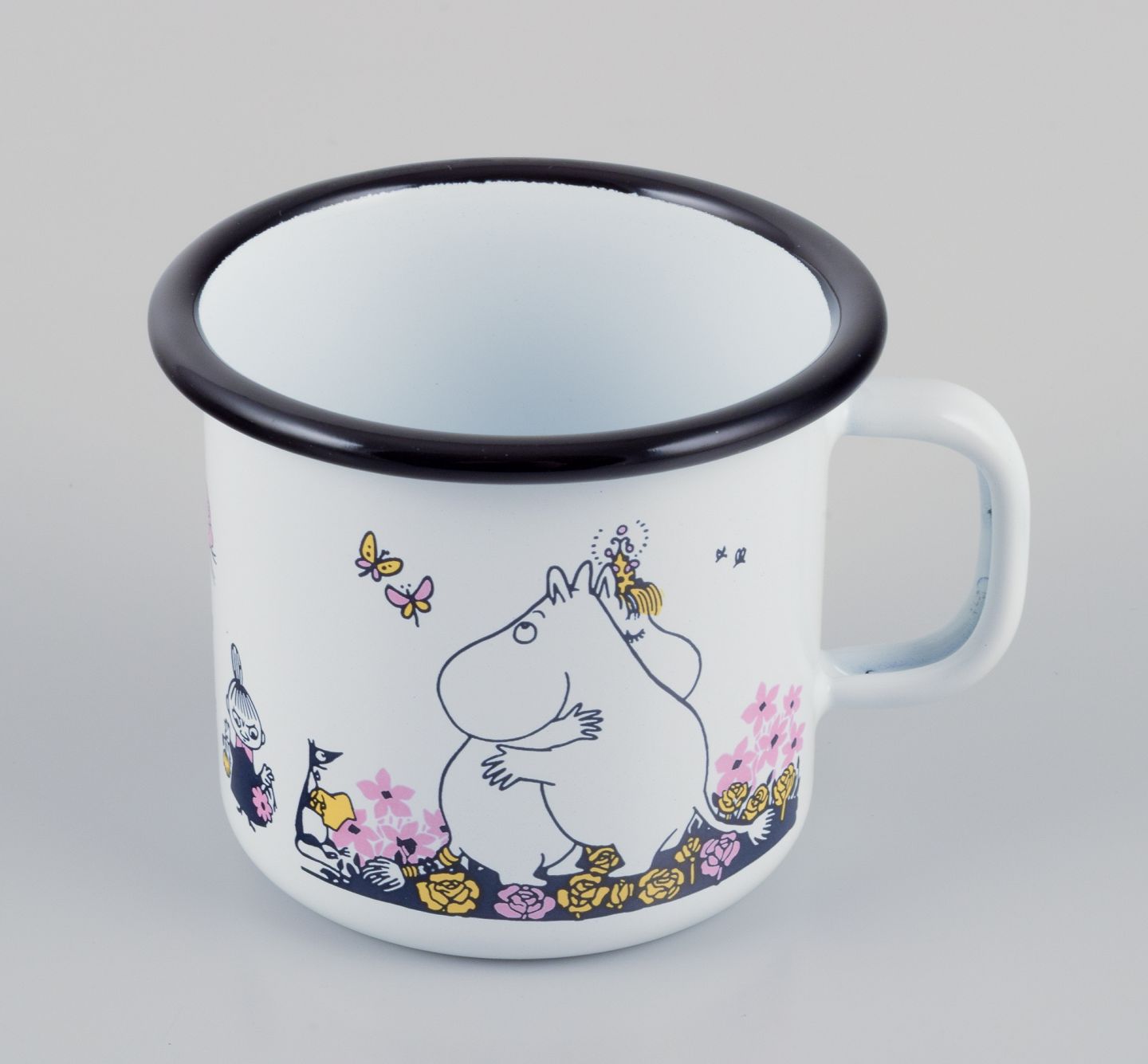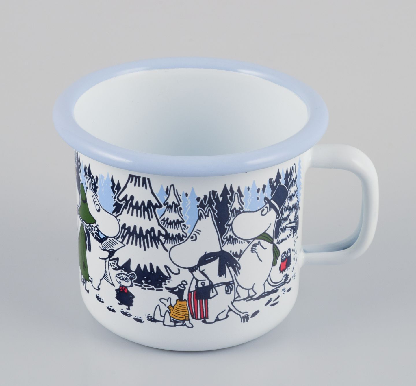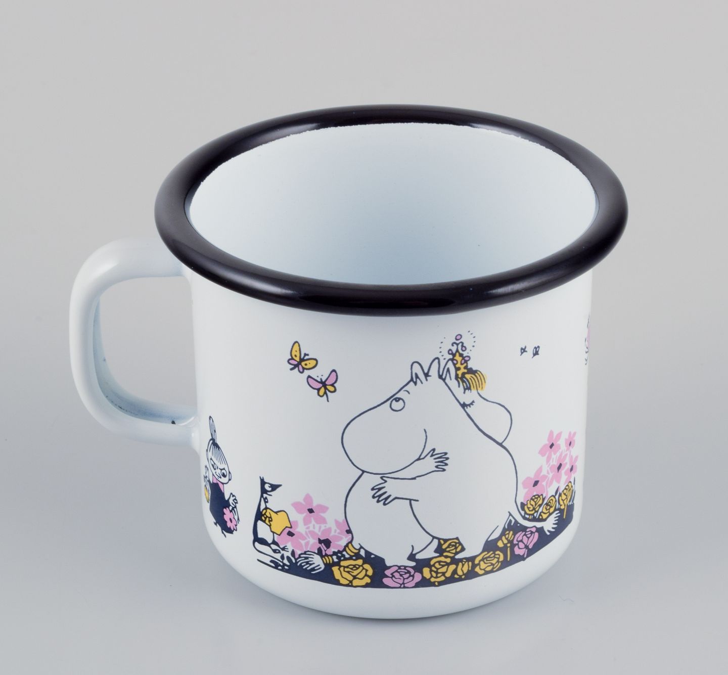 Three enamel mugs with different motifs from the Moomin troll universe.