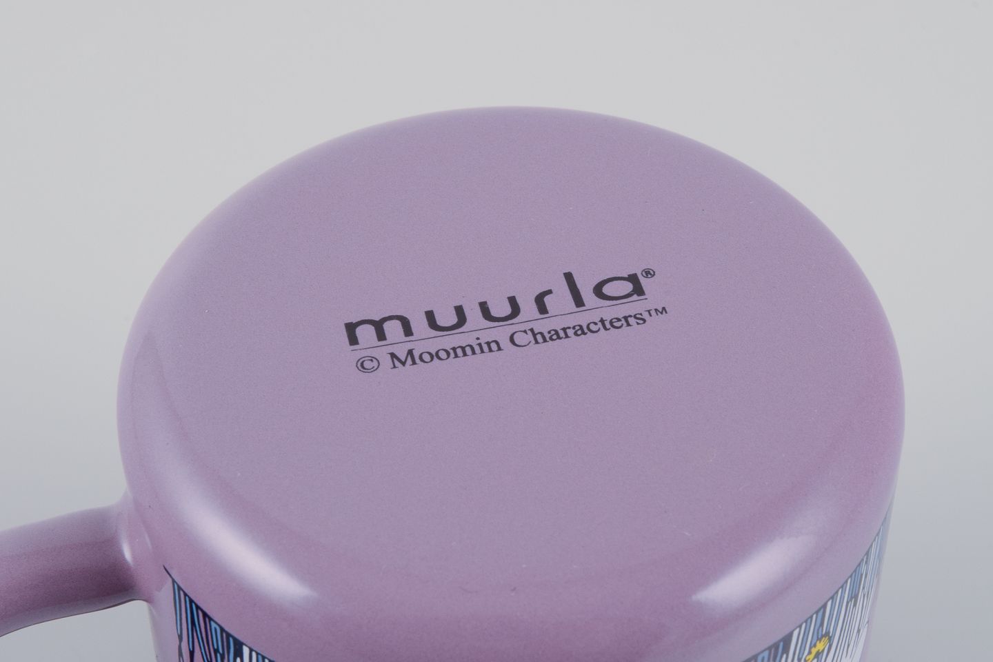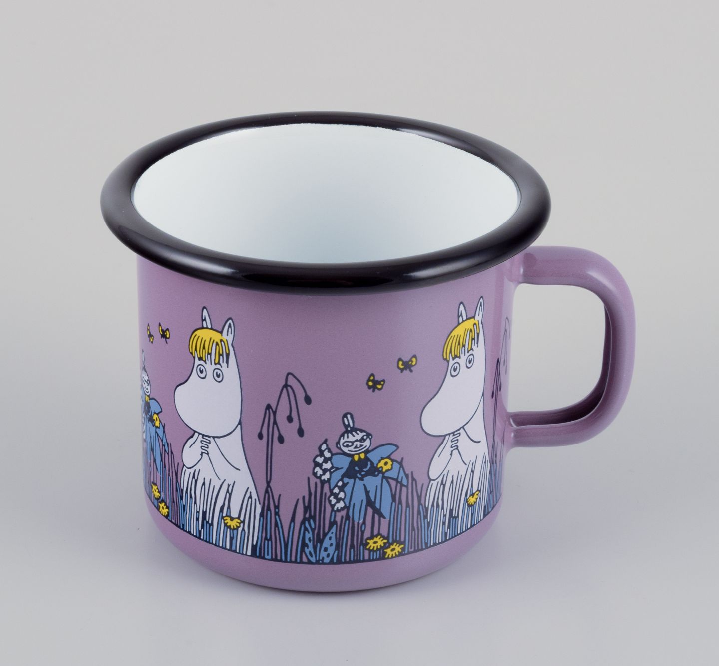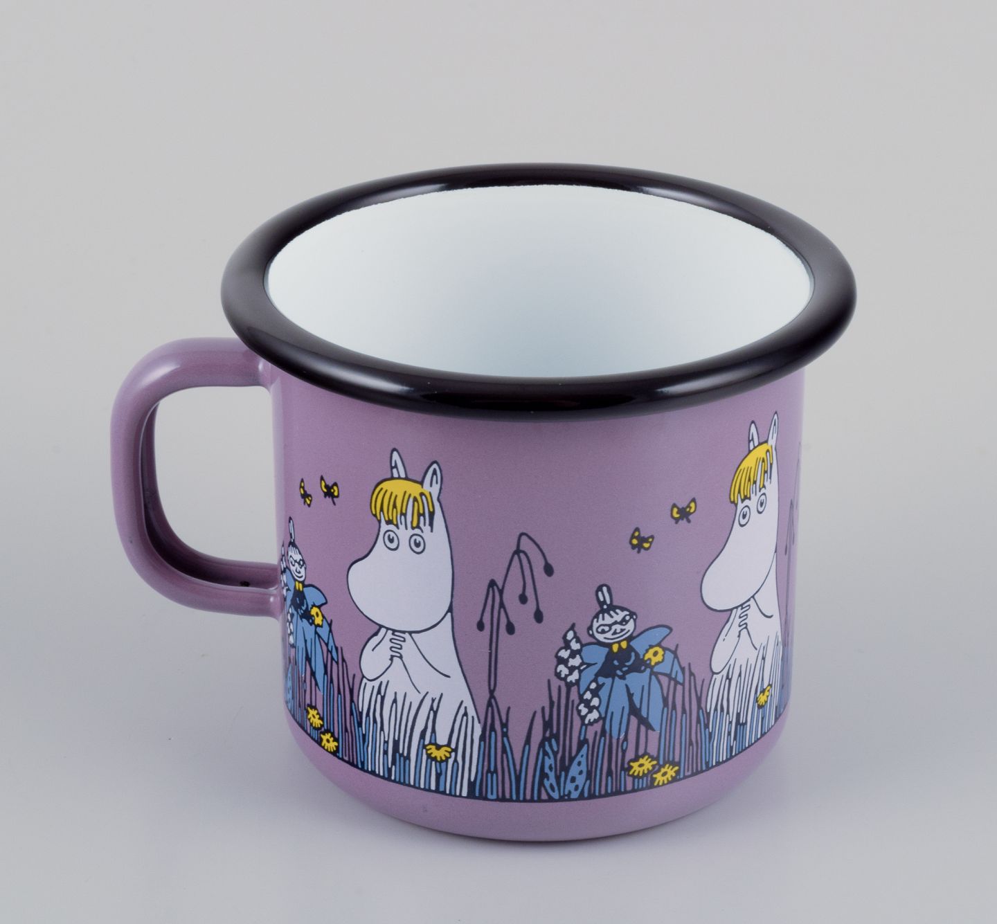 Three enamel mugs with different motifs from the Moomin troll universe.