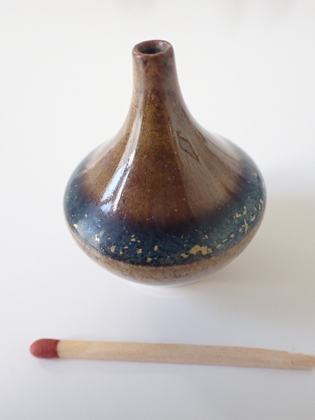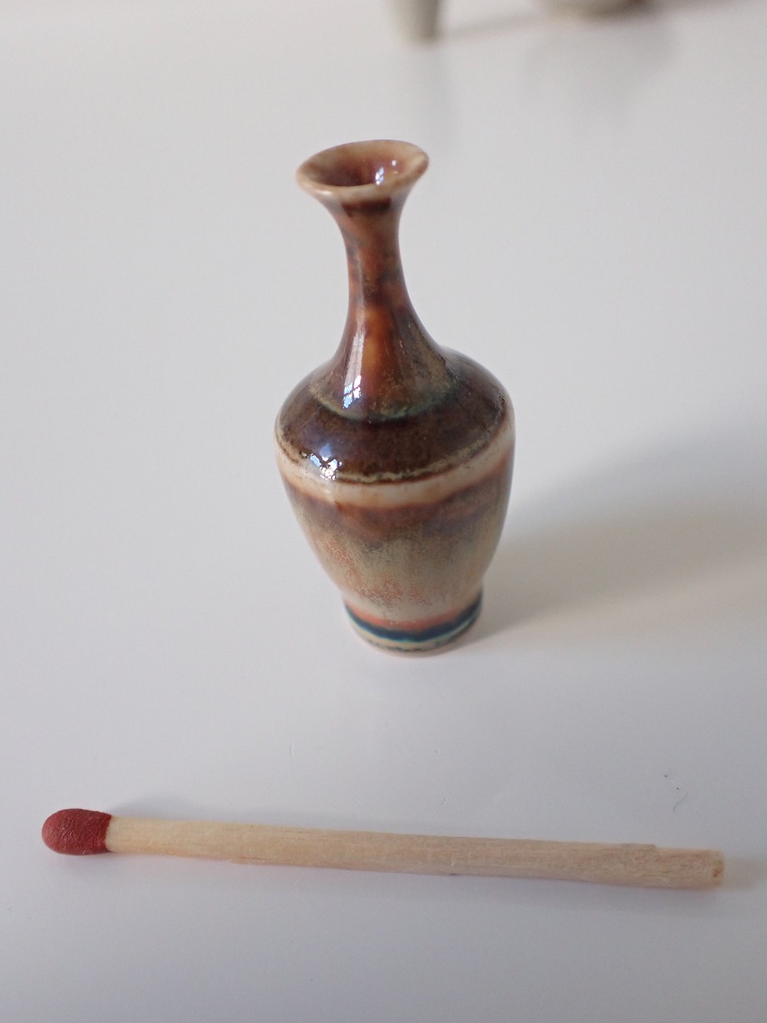 4 miniature stentøjsvase med blå/brun og sand glasur. Höganäs, J.H. og J.I. Højde: 4 - 5 cm. Bredeste diameter: 2,1 - 4 cm. I fin stand. Priser: 200 - 250 kr.