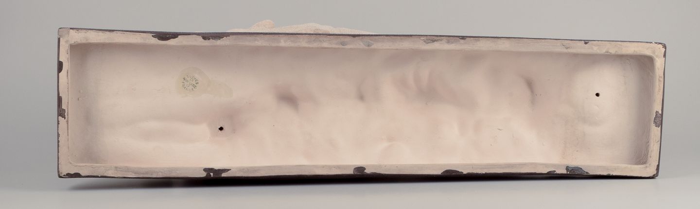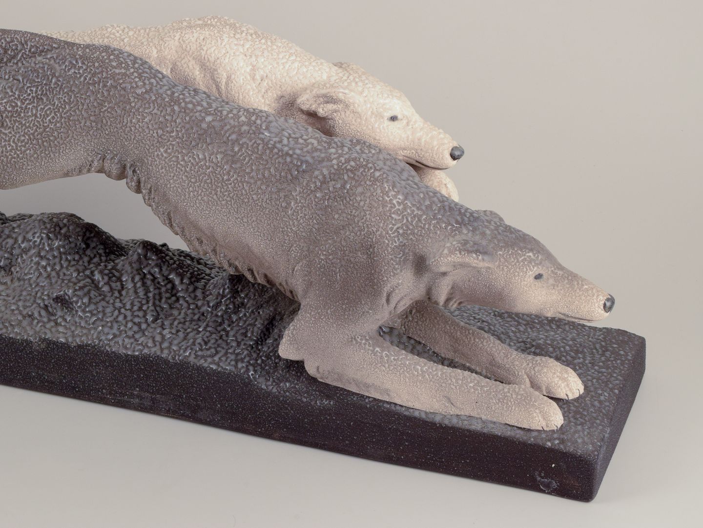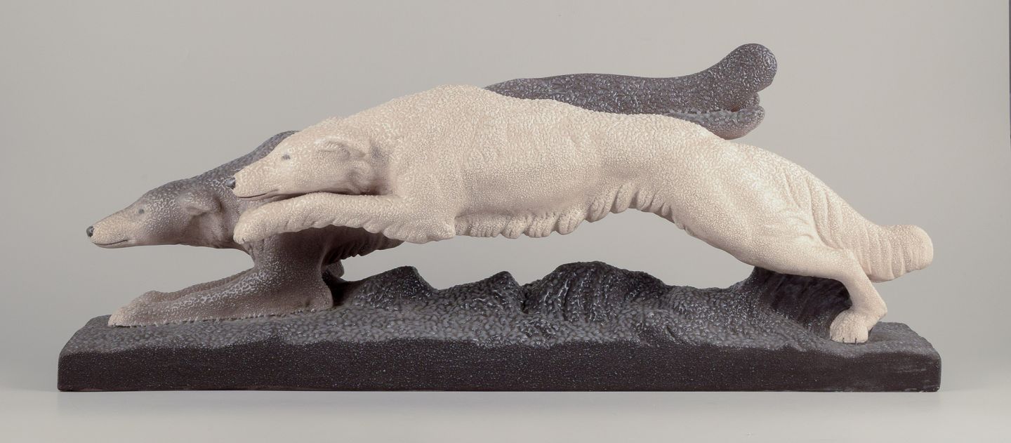 Kolossal keramikskulptur af to løbende greyhounds. Art Deco.