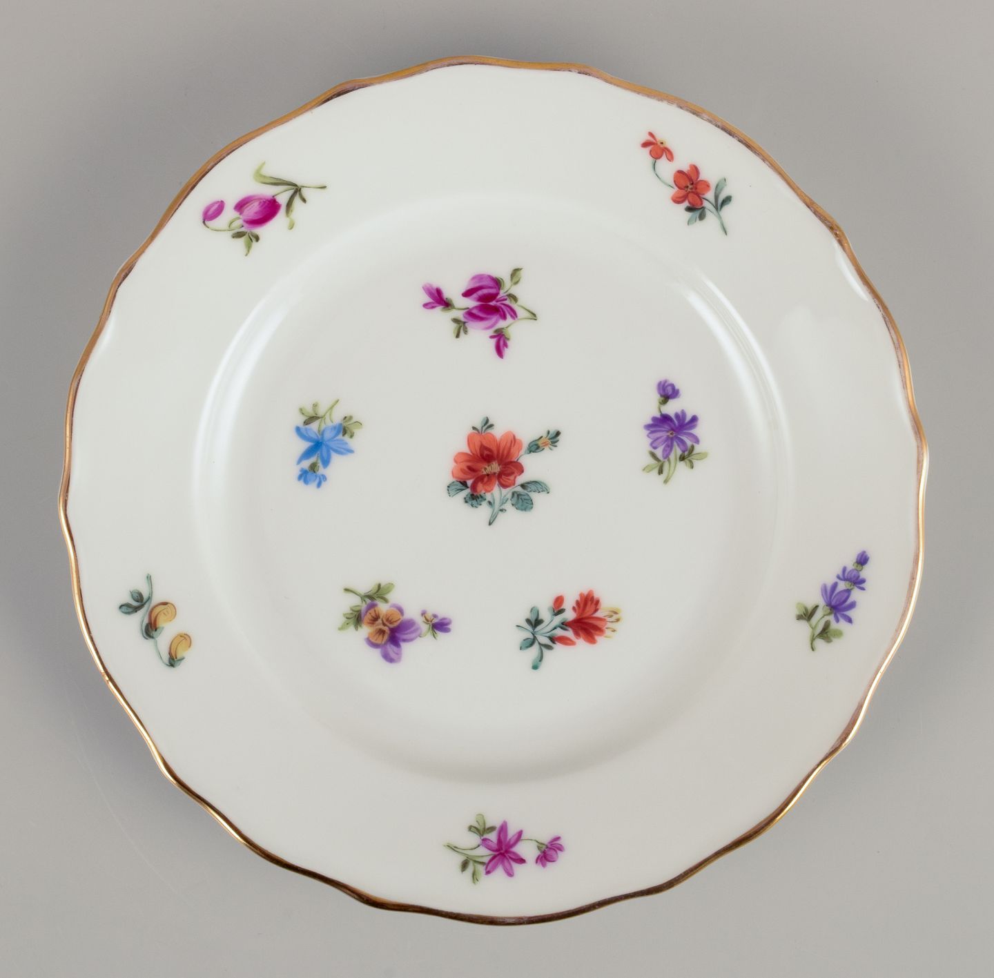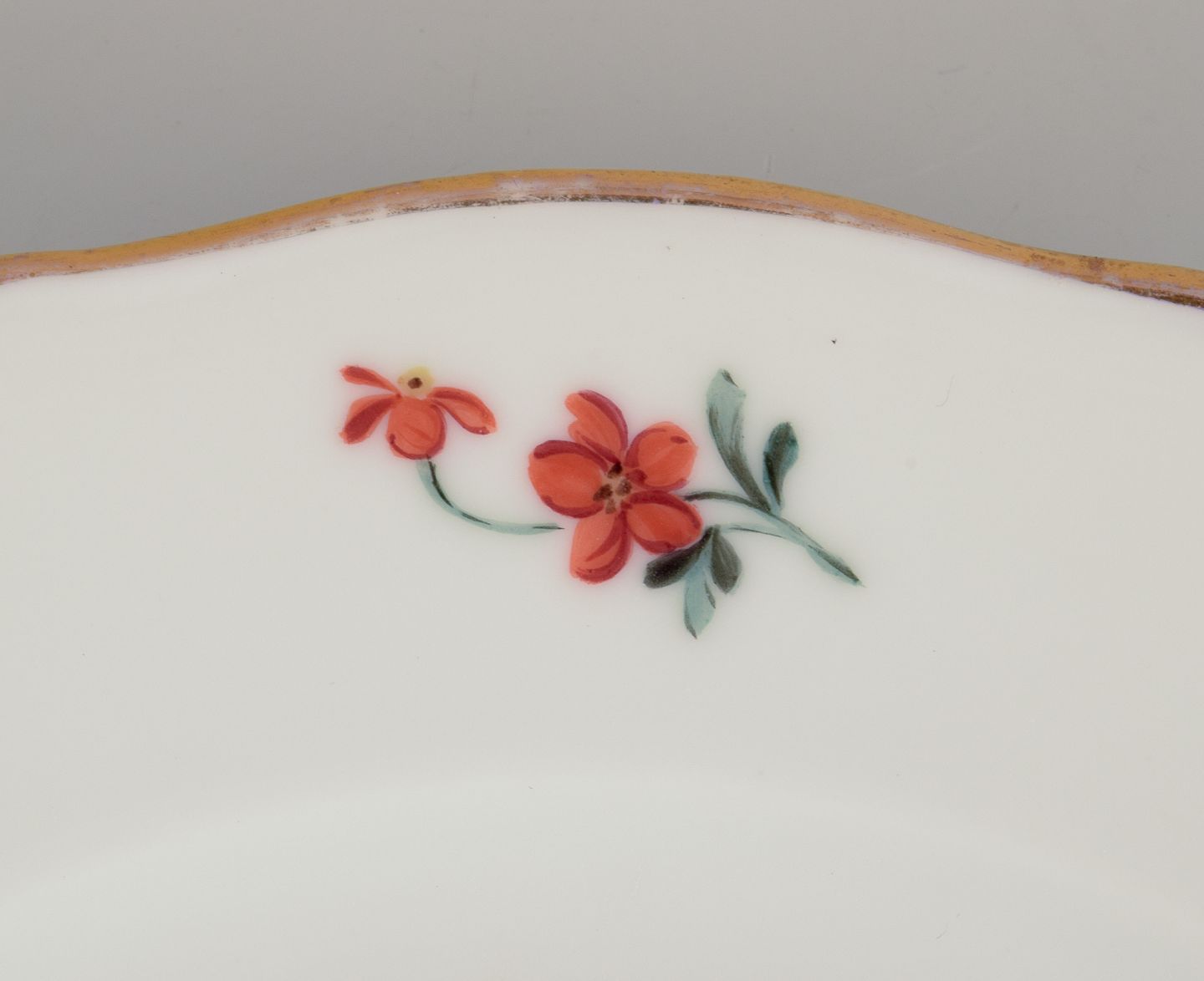 Hand-painted with floral motifs in polychrome colors, gold rim.