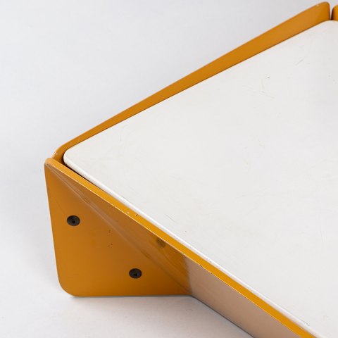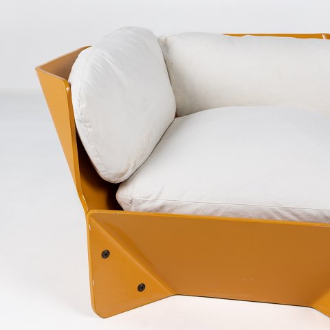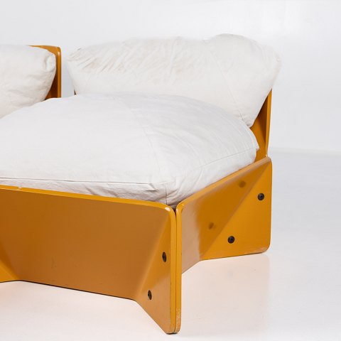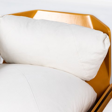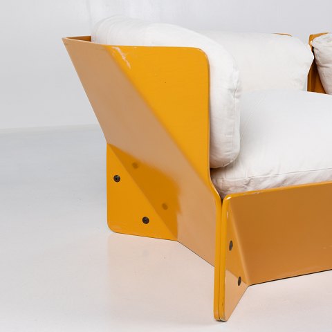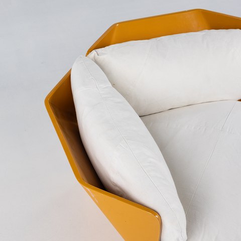 Sæt bestående af to lænestole og en skammel i i hhv. gult og hvidt plast med hynder i lyst tekstil.