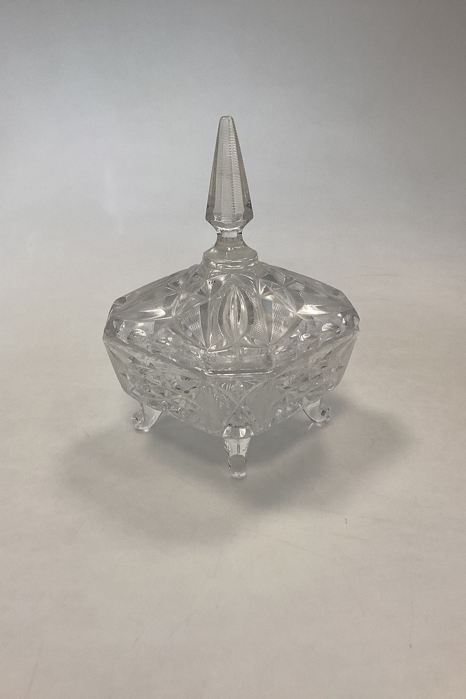 Faceted Glass Bonbonniere on feet. Measures 17 cm x 11.5 cm / 6.7 in. x 4.53 in.