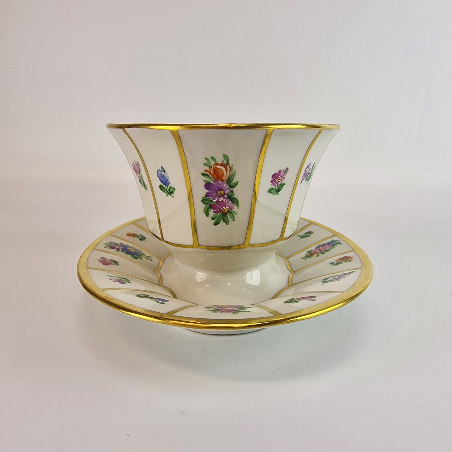 Henriette er af porcelæn og har motiver af små blomsterbuketter og guldstreger på det kantede stel.
