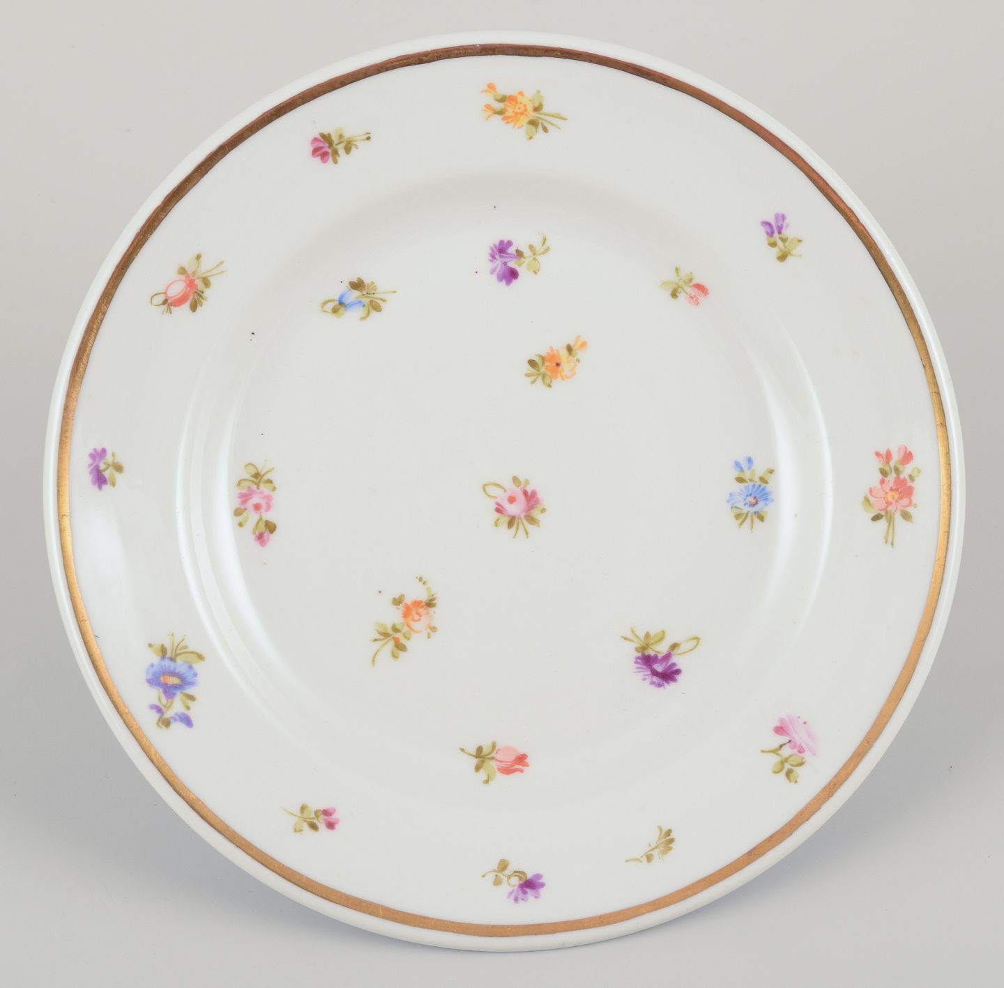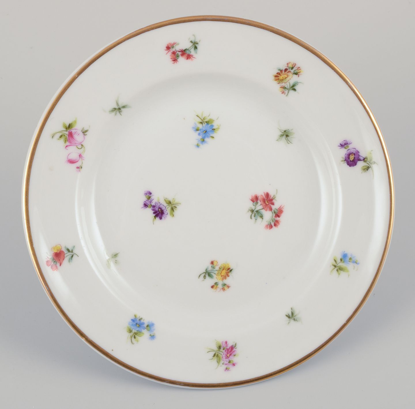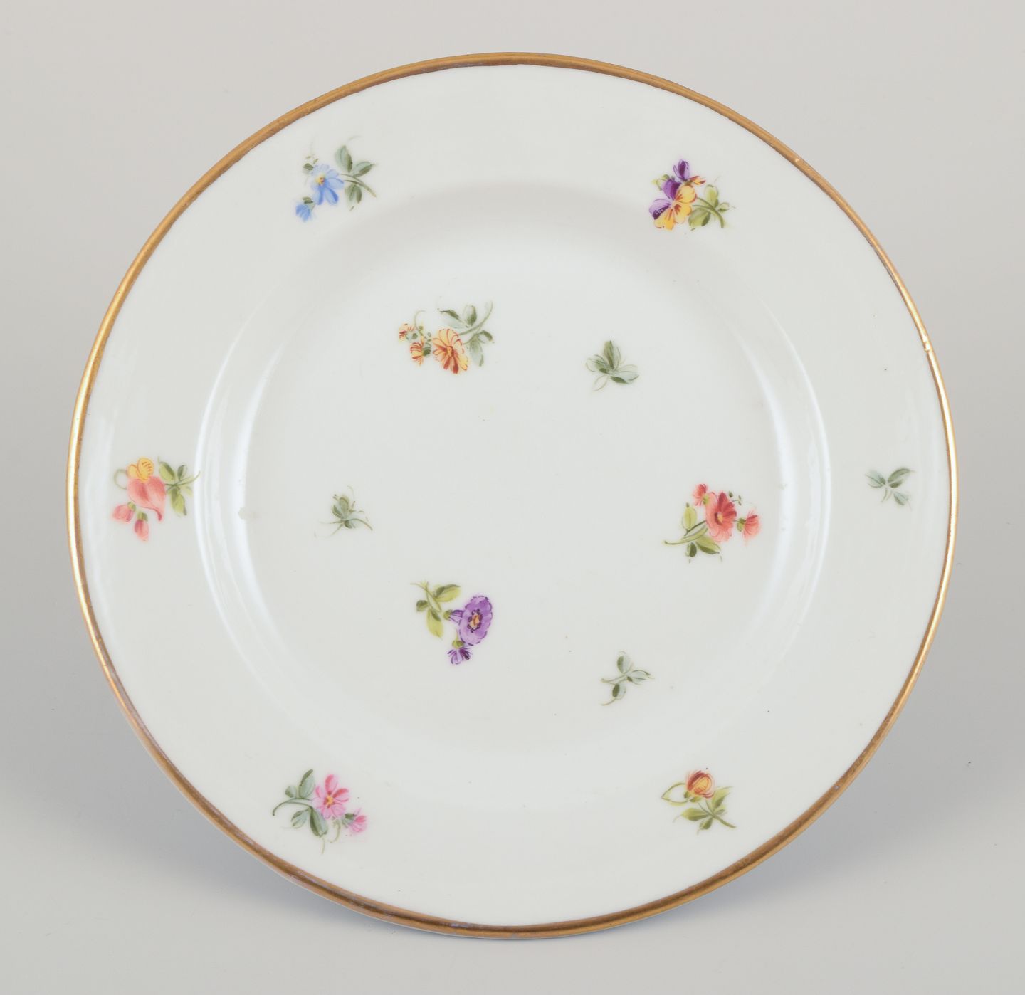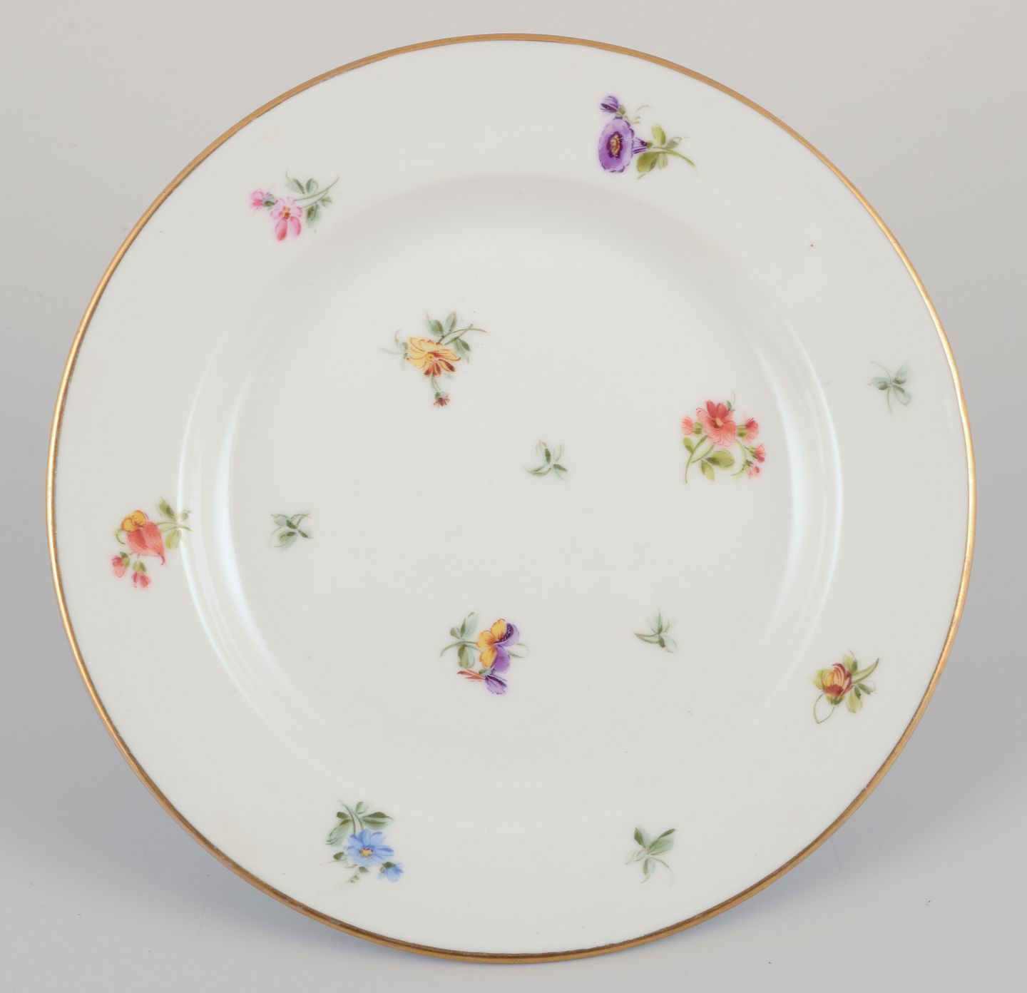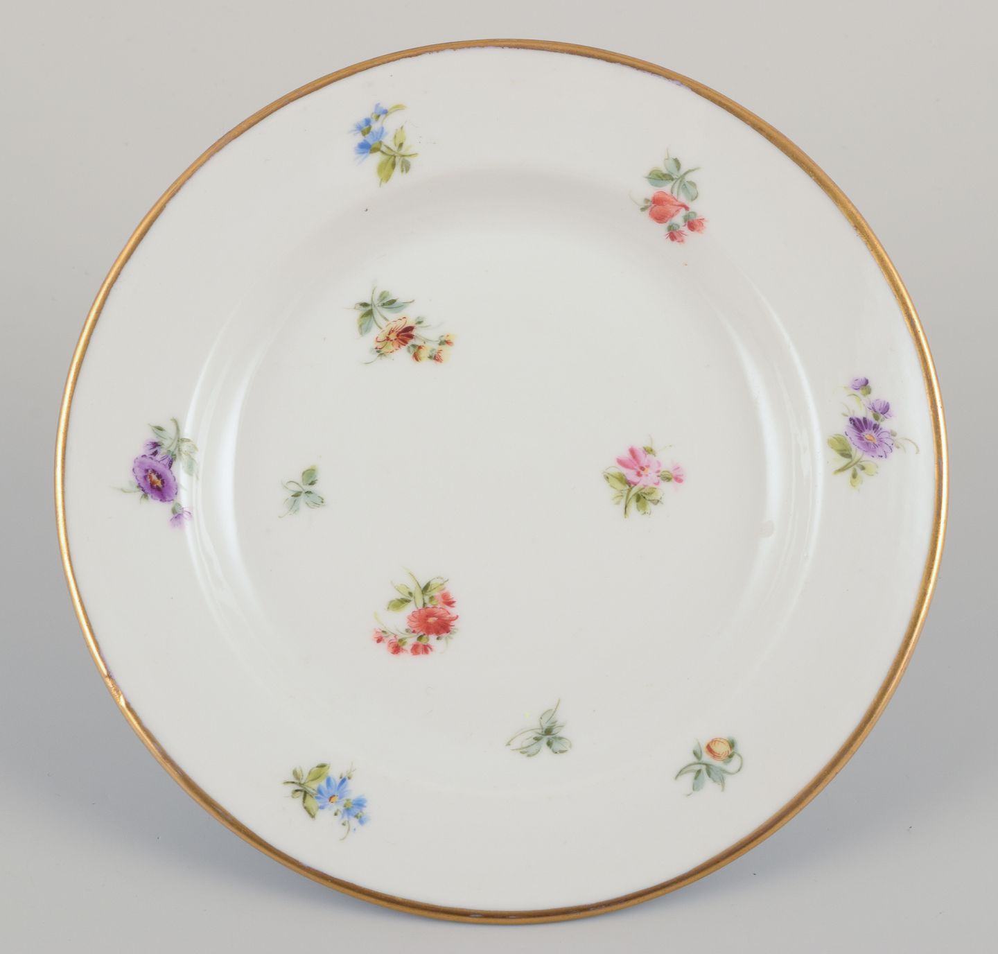 Seks små porcelænstallerkner. Håndmalet med polykrome blomstermotiver, guldkant. Porcelæn i tung og kraftig kvalitet.