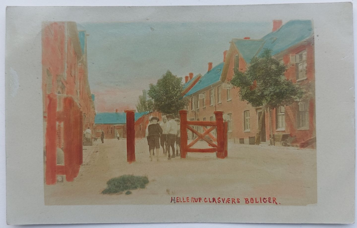 Colored postcard: Motif with life in front of Hellerup Glaswork's residences in 1909