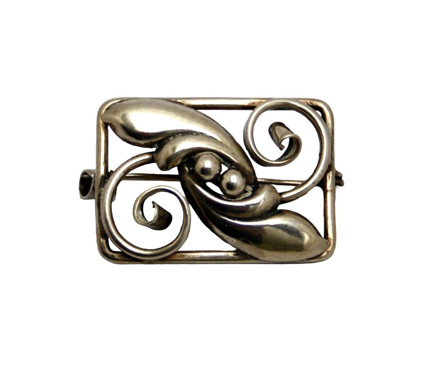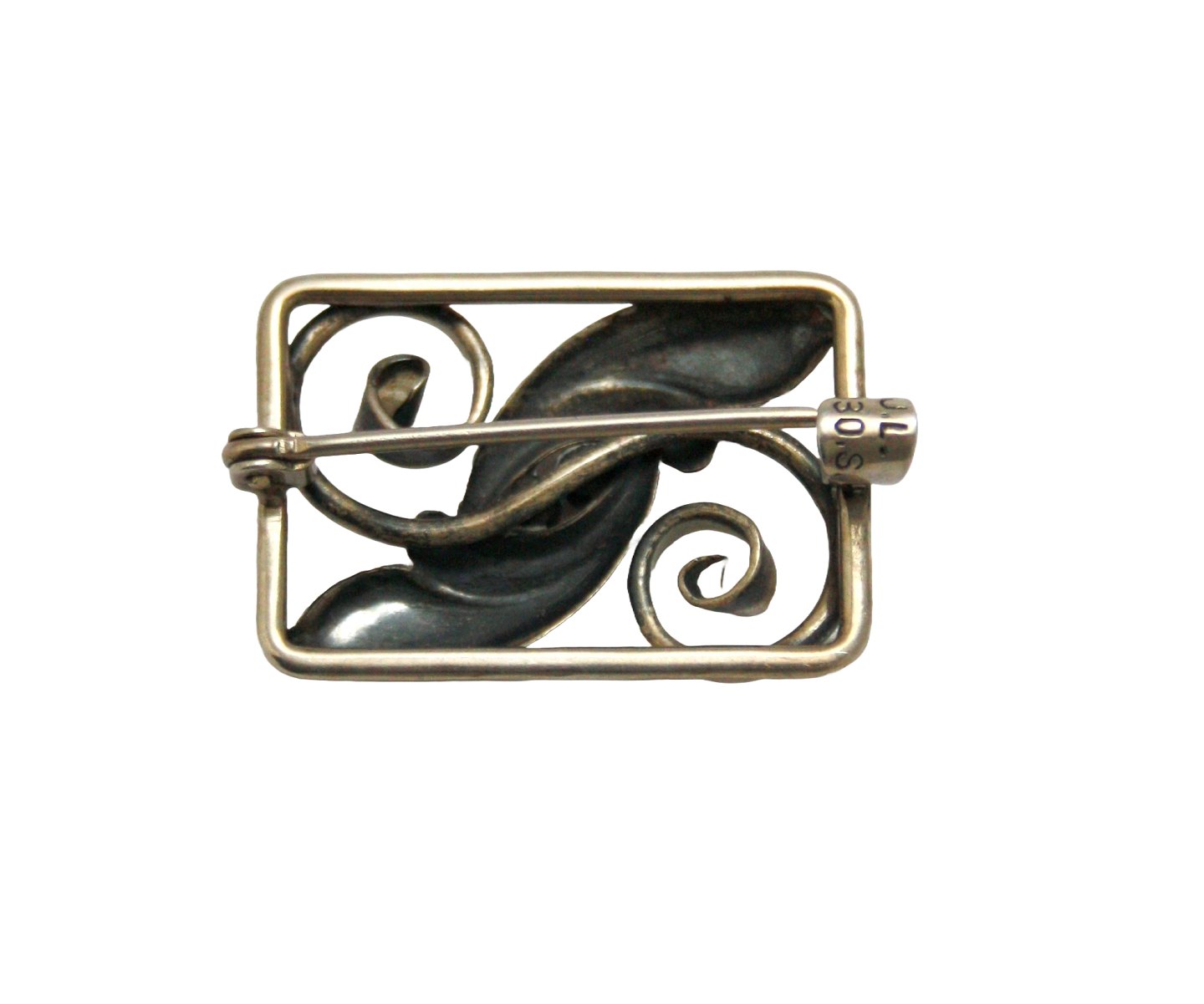 Skønvirke firkantet ornamental broche med tværliggende blad. Mrk. JL830S. Længde 3,5 cm. Bredde 2 cm. Flot stand. Pris: 550 kr.