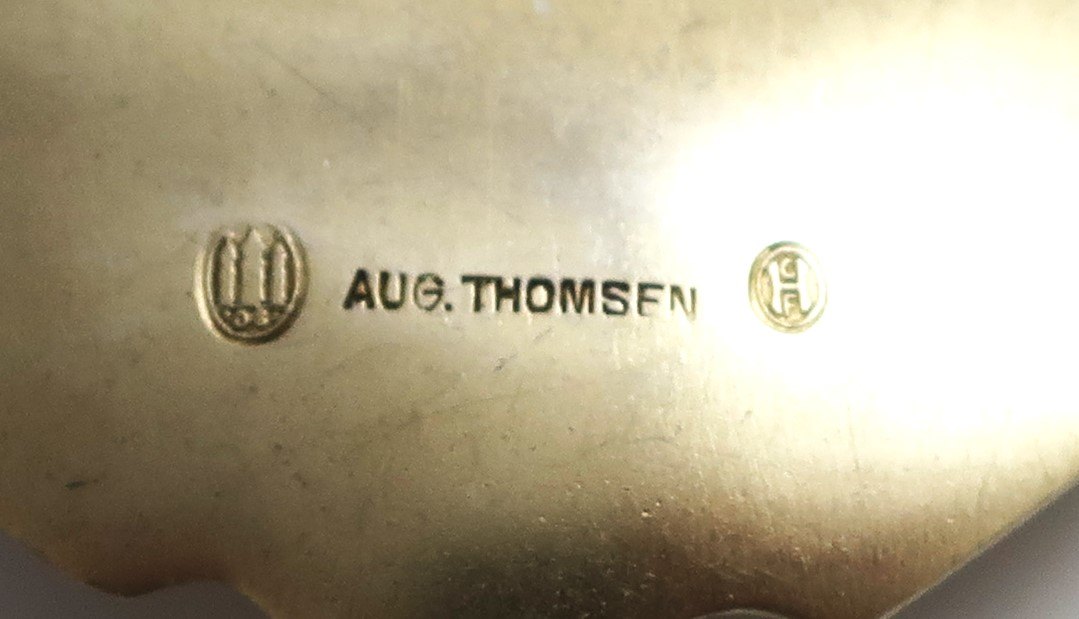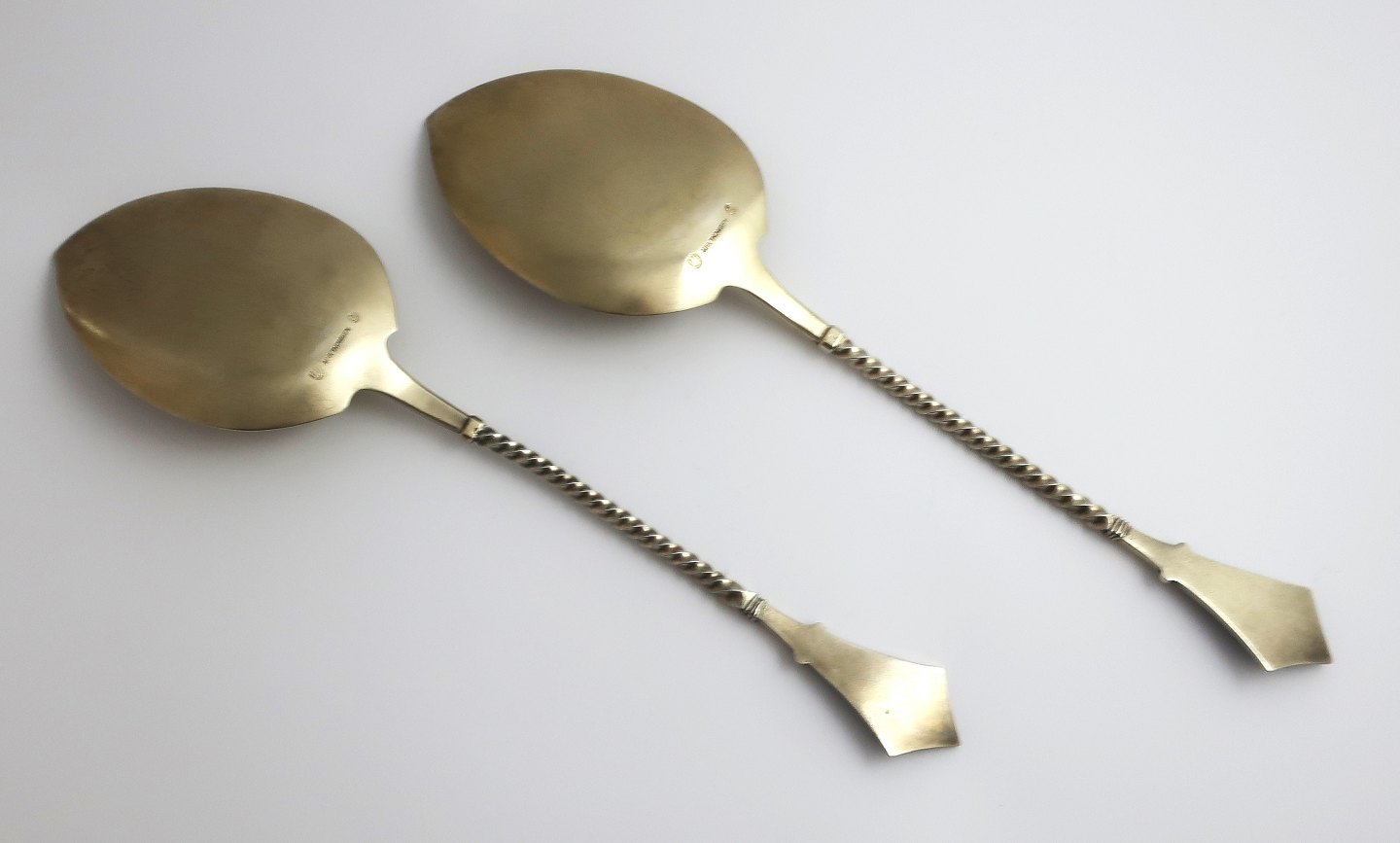 Aug. Thomas. Silver-gilt serving parts with enamel (830). A pair. Length 25 cm. Produced 1903.