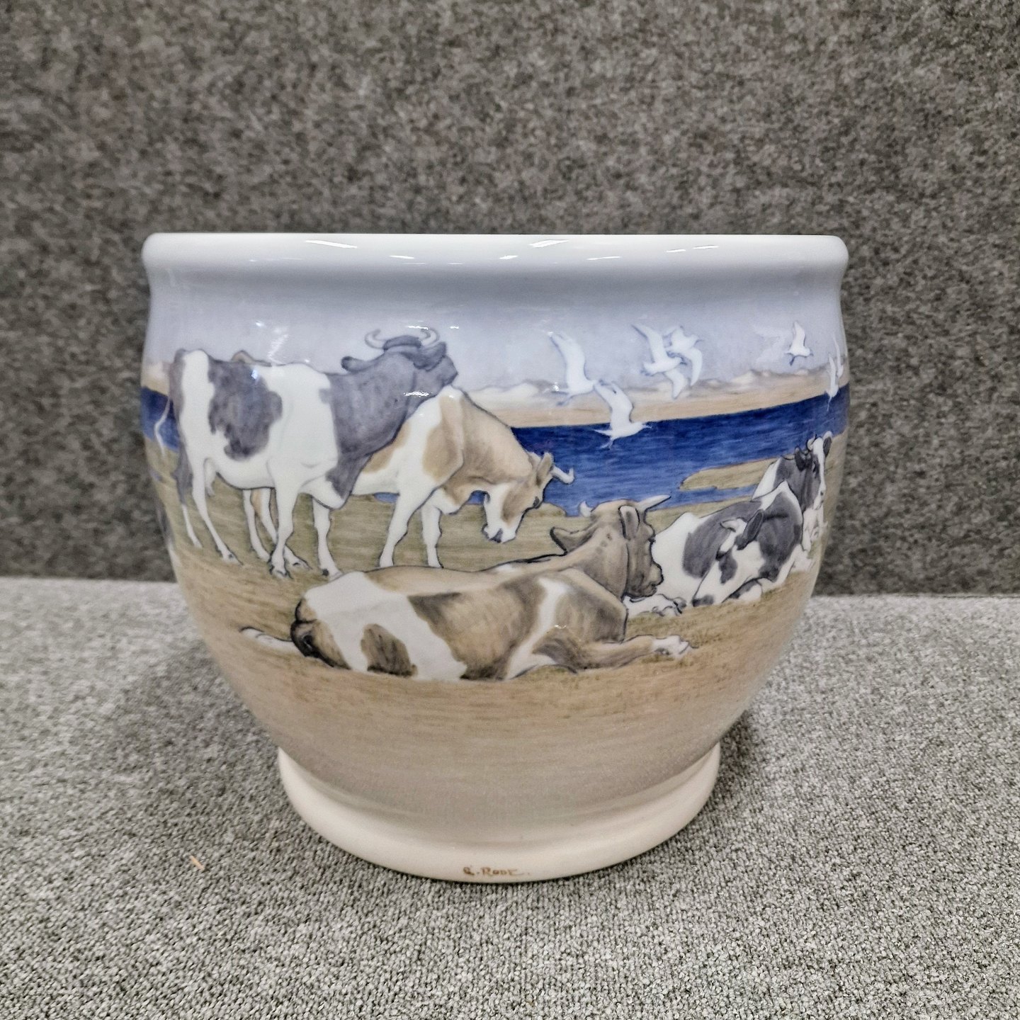 Art nouveau unika vase i porcelæn med motiv at køer og måger ved vandet. Nr 9/12 1916