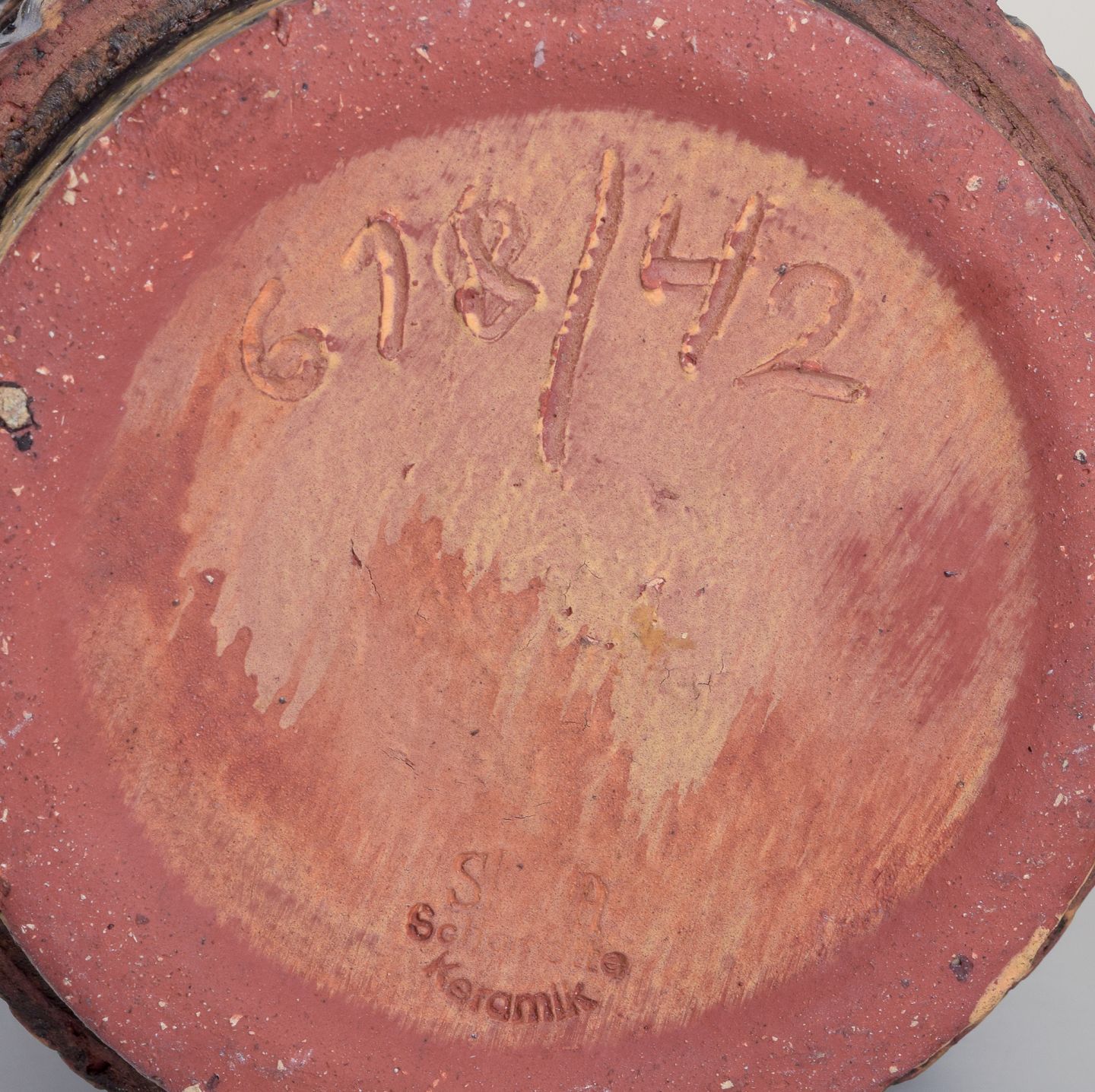 Håndglaseret. Glasur i okkergule og mørkebrune toner, indvendigt med grøn glasur.