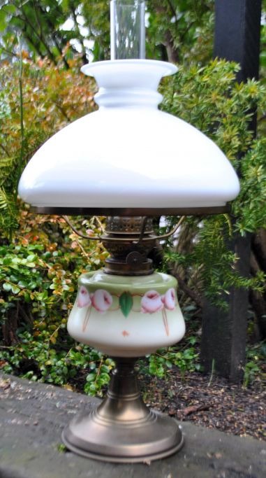 Kosmos Brenner petroleums lampe, Tyskland, ca. 1900. Fod i messing og opaline glas med emajle dekorationer af roser og blade og forgyldninger. Hvidt opaline glas skærm og klar brændeglas. Højde inkl. brændeglas: 53 cm. Dia: 27 cm.