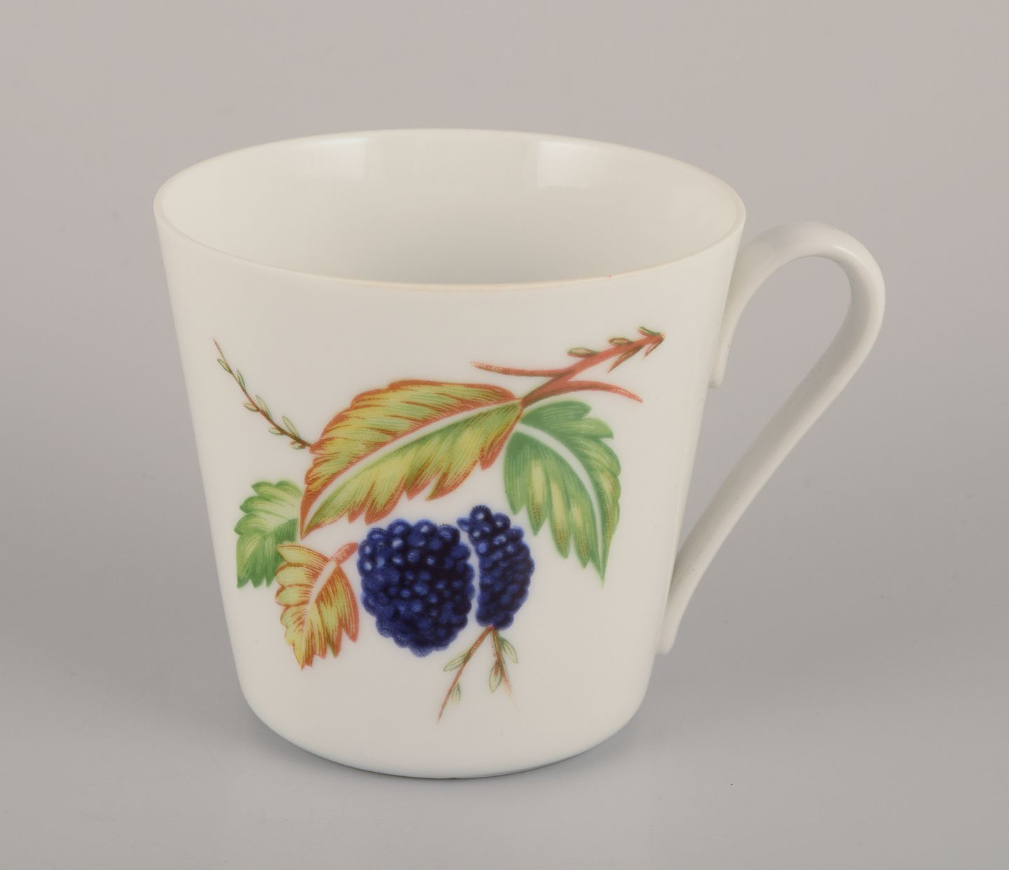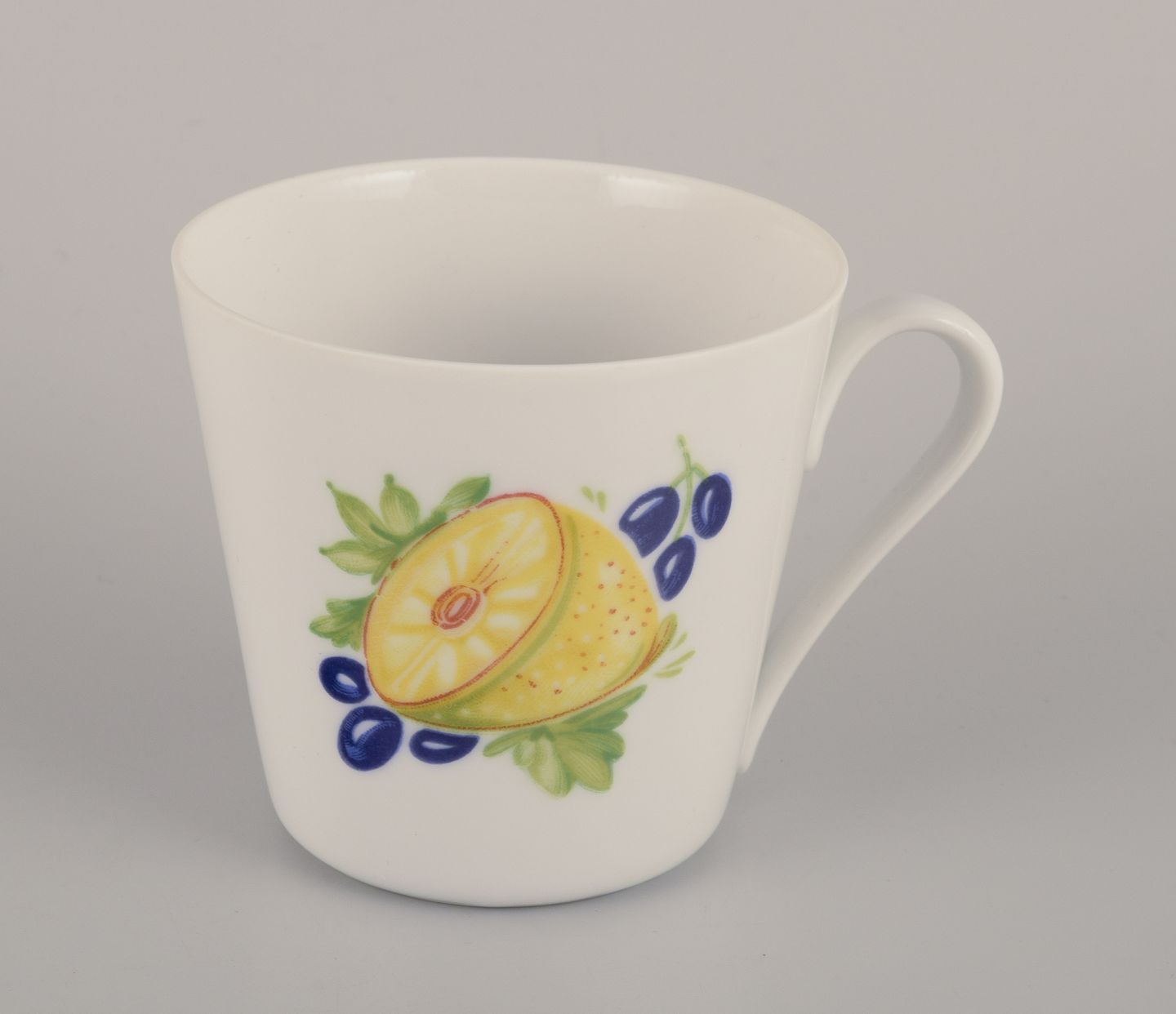 Dimensions: Diameter 7.5 cm (without handle) x Height 7.0 cm.The Danild No. 50 "Picnic" fruit and vegetable dinnerware set was released in 1961 and designed by Frank Lensfort. It is made of porcelain and decorated with transfer prints.