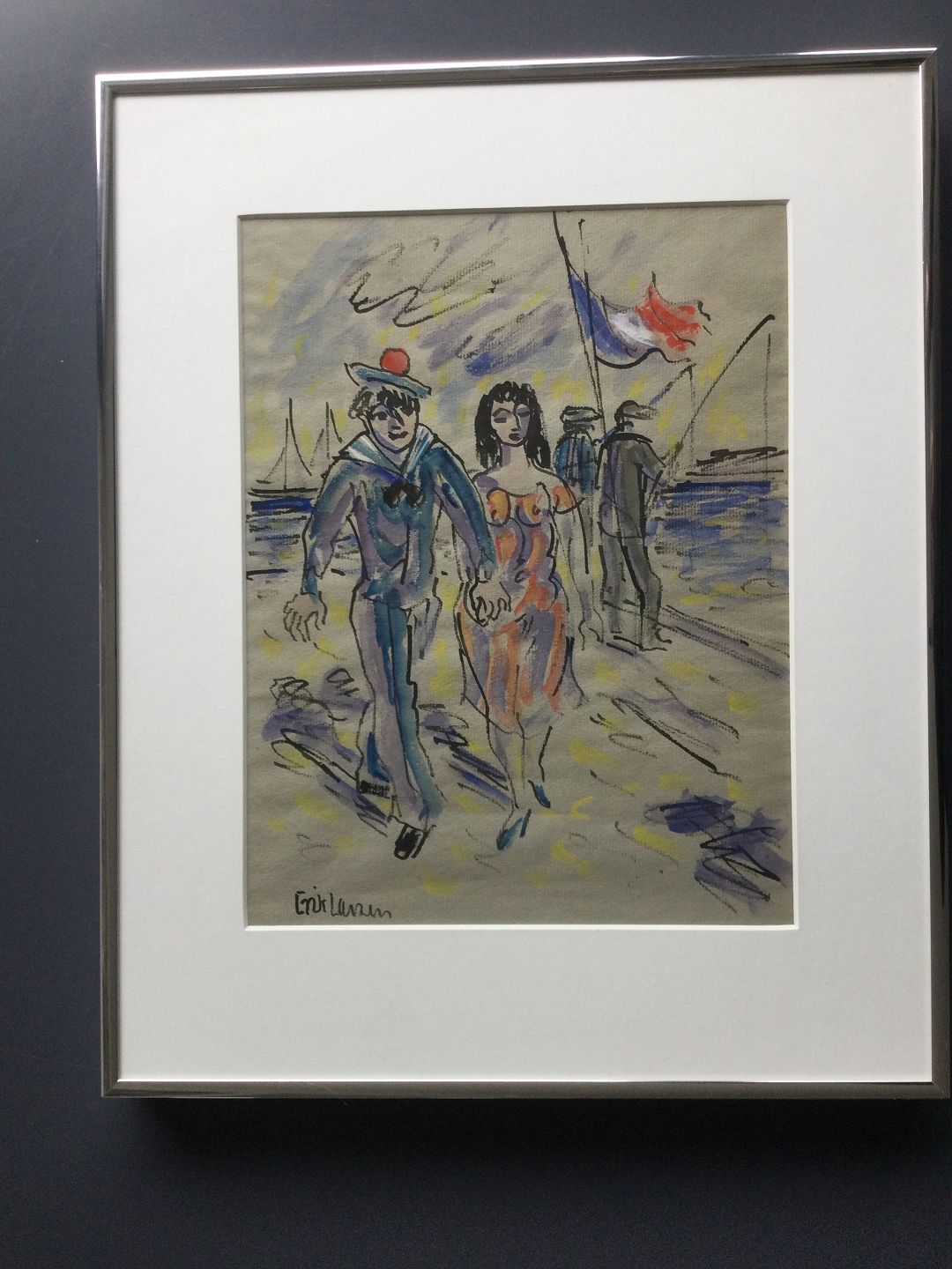 Pastel af Erik Larsen - Fransk havneparti med sømand og kvinde.