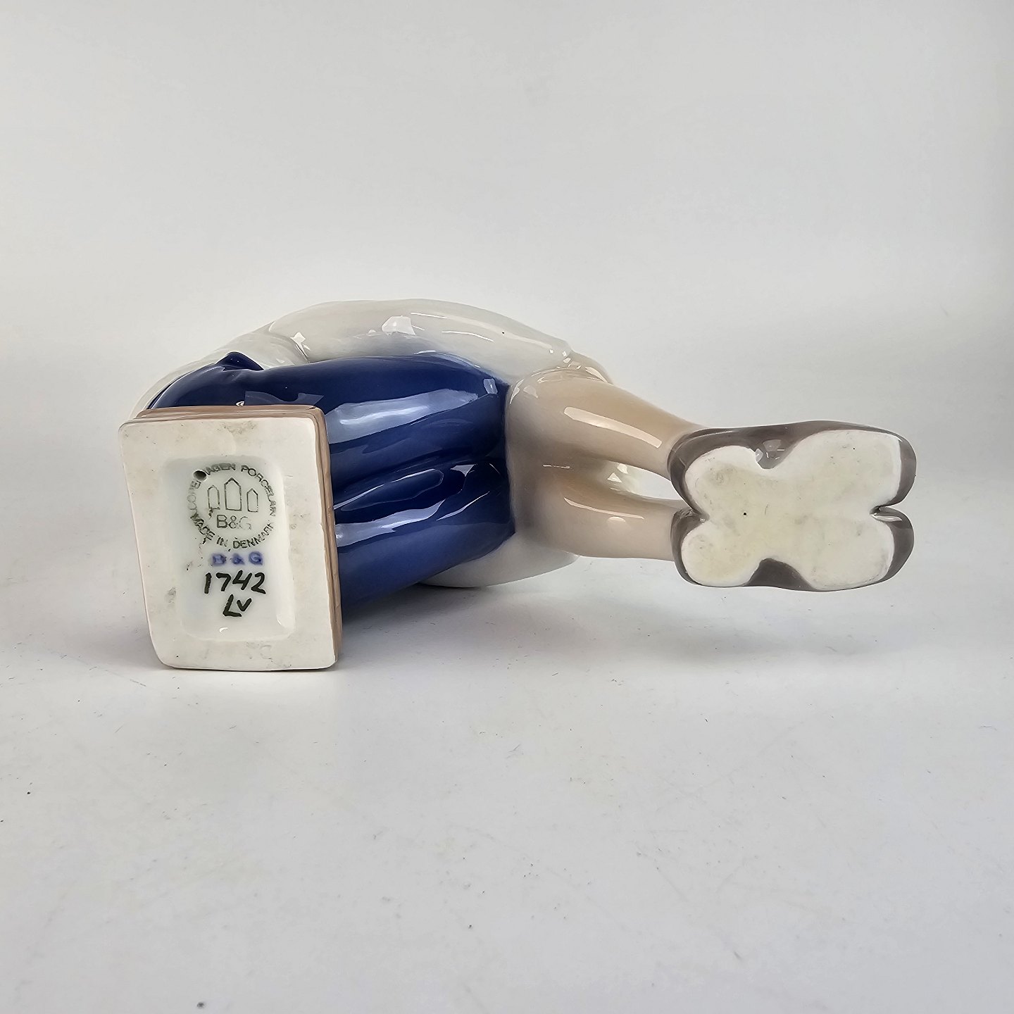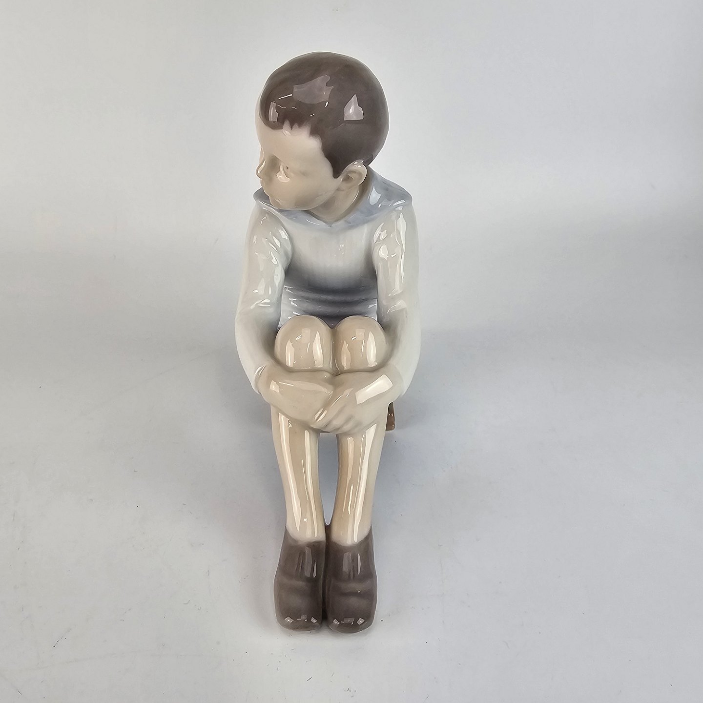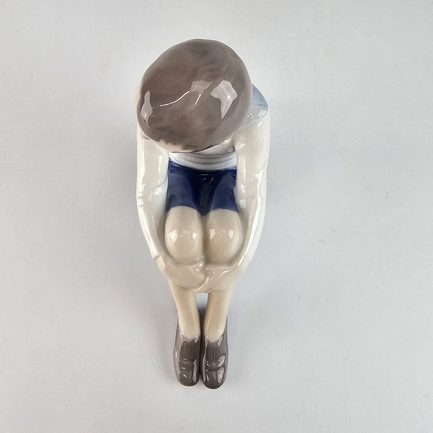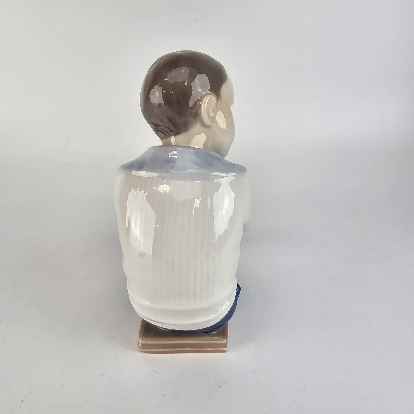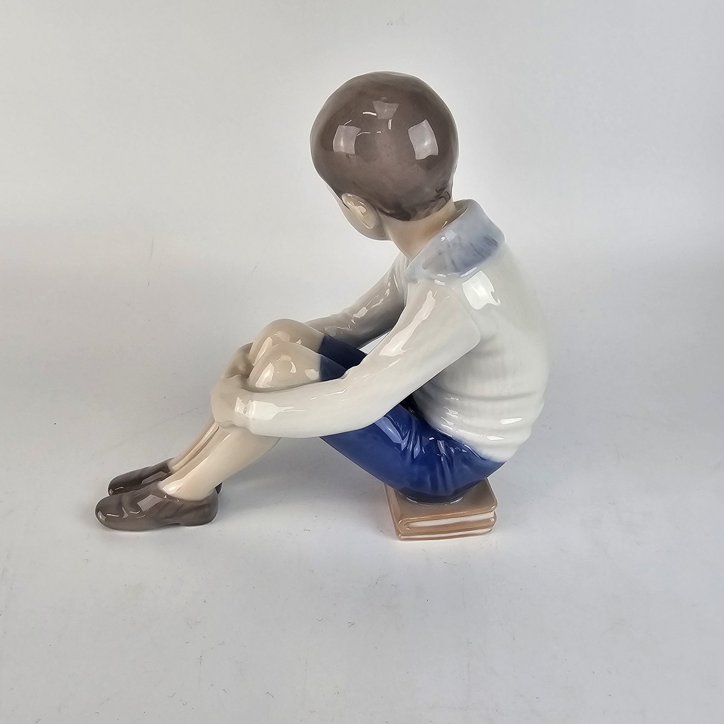 Figur af håndmalet porcelæn, udformet som en dreng siddende på en bog. Nr. 1742