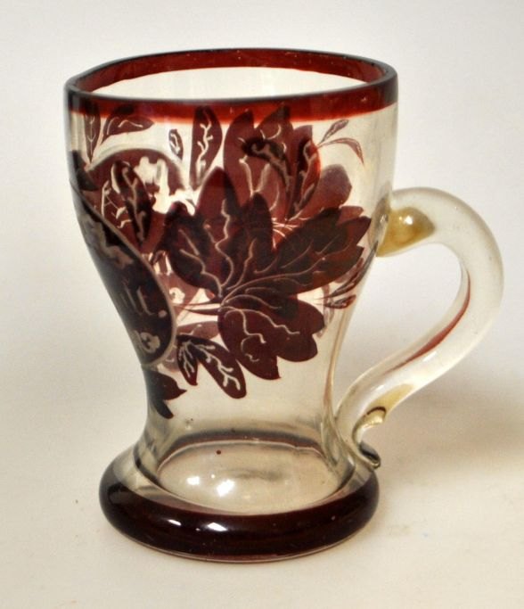 Tysk hanke glas krus, 19. årh. Klart glas med rødt overfang. Slebet. Med tekst: Aus Freundschaft. H.: 8 cm.