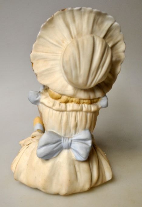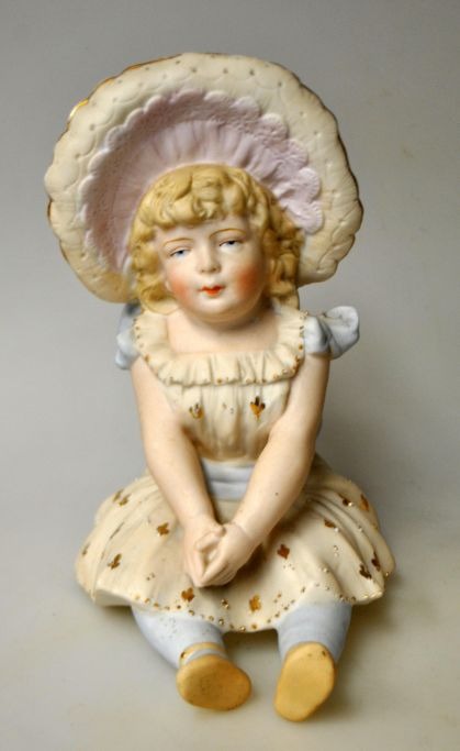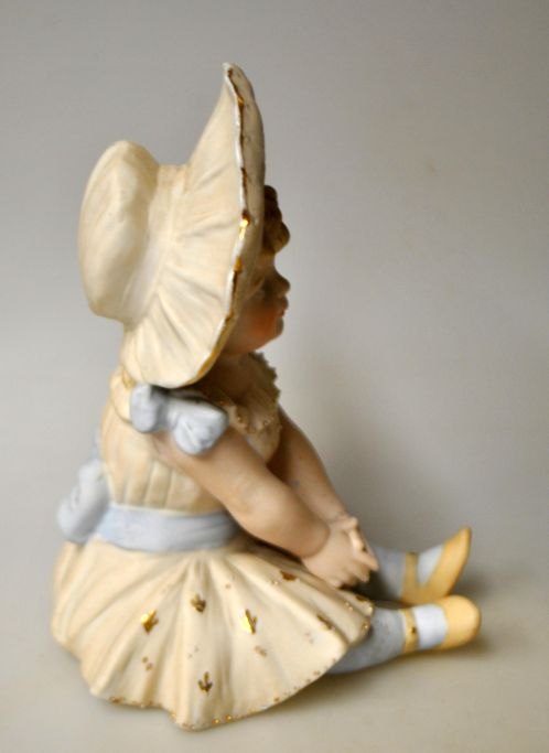 Tysk koldbemalet bisquit figur af siddende lille pige med hat, 19. årh.
