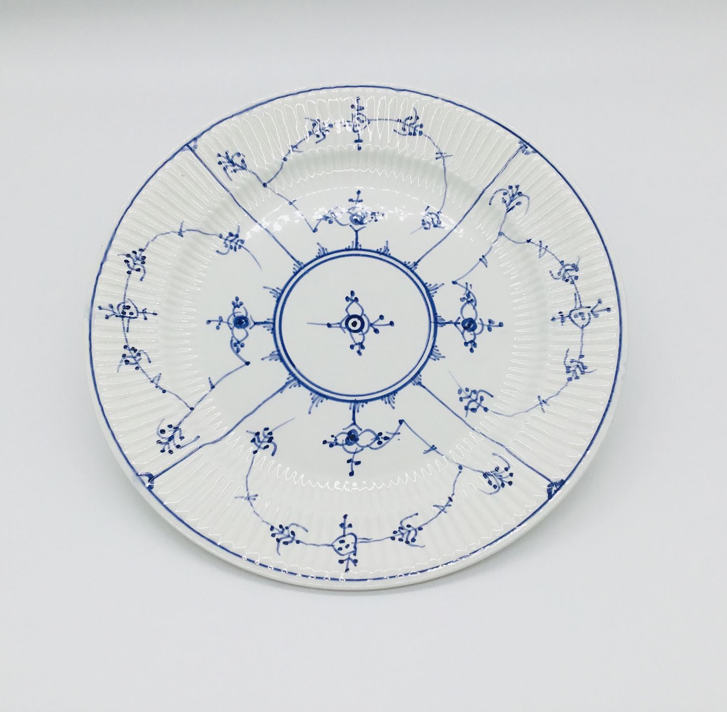 Text available in Danish: Aluminia Musselmalet, produceret 1870-1920 uden krakelering og i hel og fin stand, ubetydelige brugsspor. Middag 25 cm, Frokost 21,5 cm, Lille dyb 21,5 cm, Stor dyb 24 cm. Spørg efter antal.