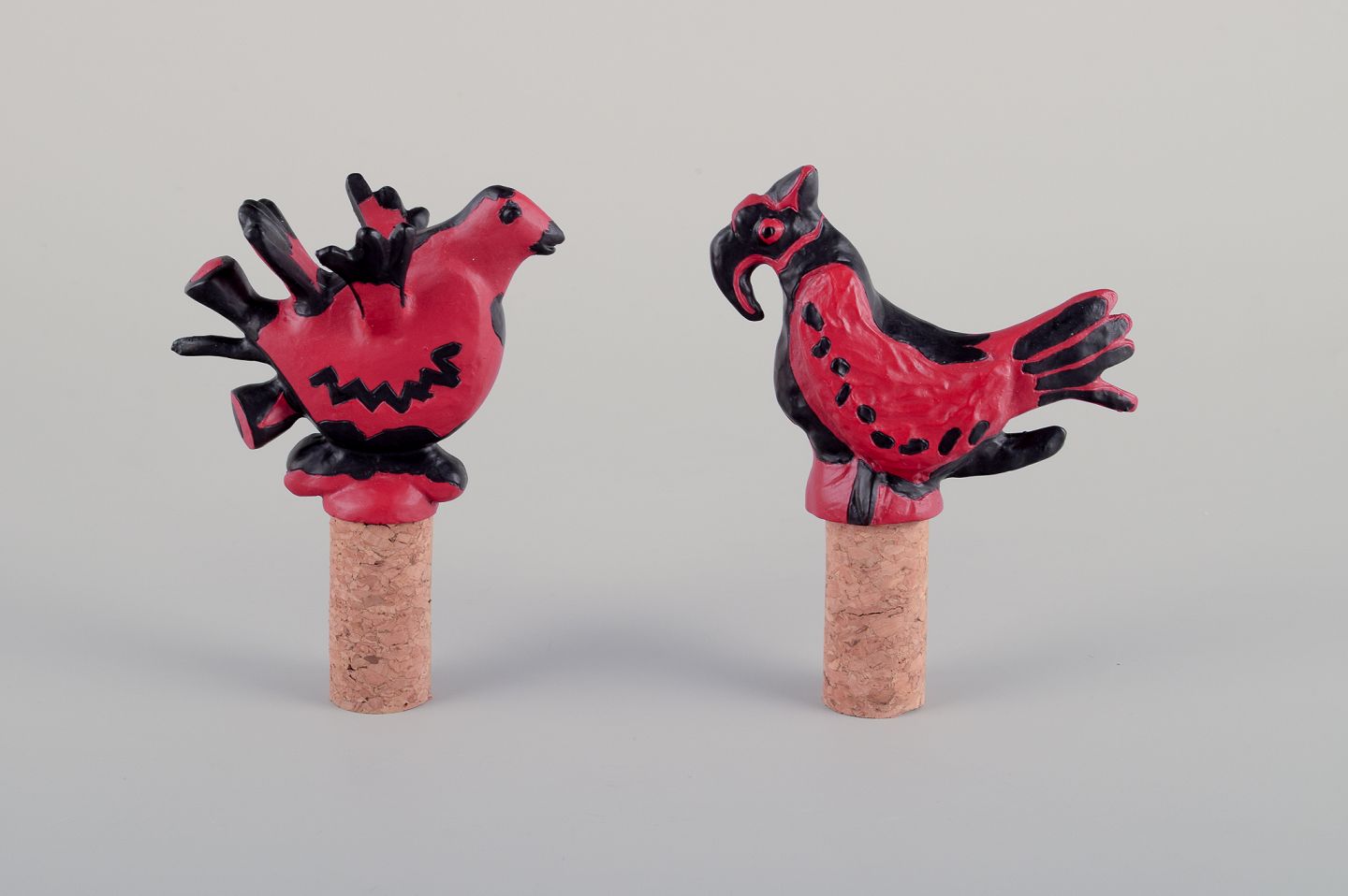 Blå kat (proptrækker) og to røde fugle (monteret på korkpropper).