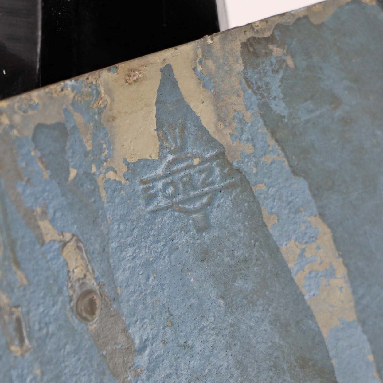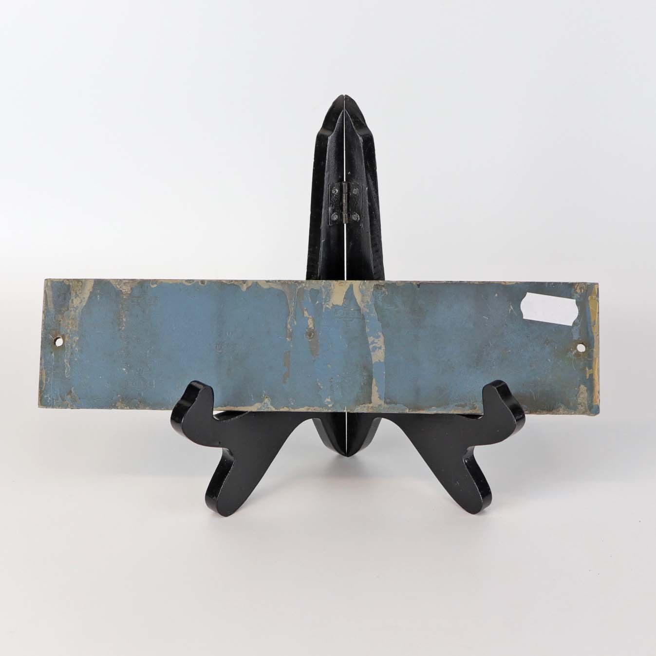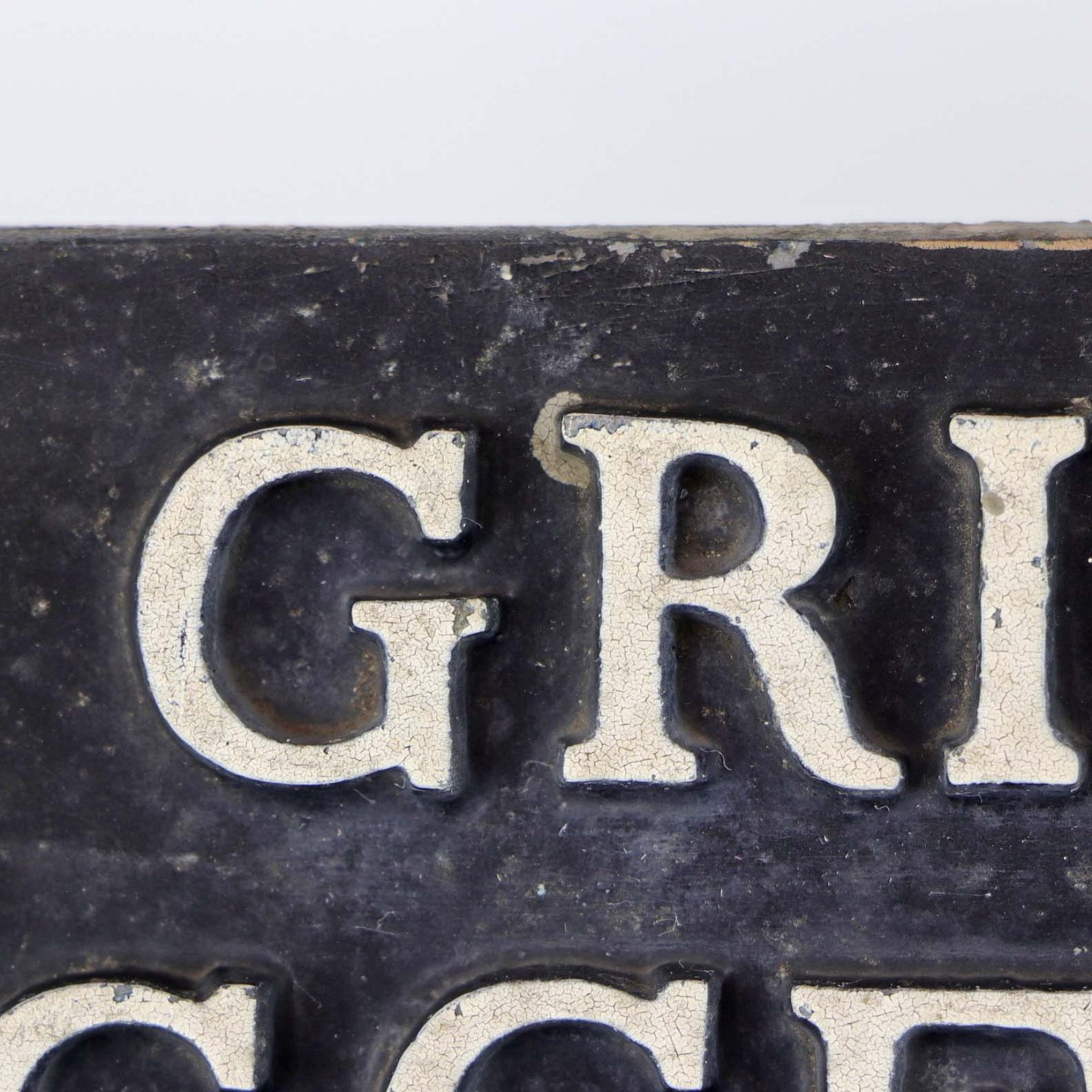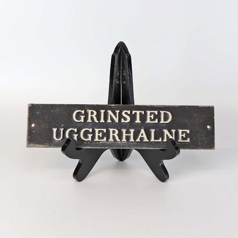 Ældre skilt i sortmalet metal med hvide udstående bogstaver med teksten Grinsted Uggerhalne