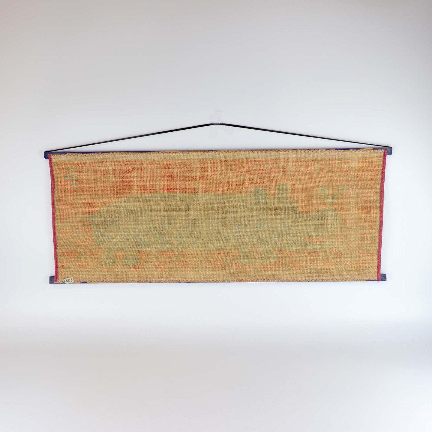 Vægophæng i malet hessian med motiv af fugl på flodhest i blå, turkis, orange og pink nuancer med blåmalet træramme og sort gummisnor