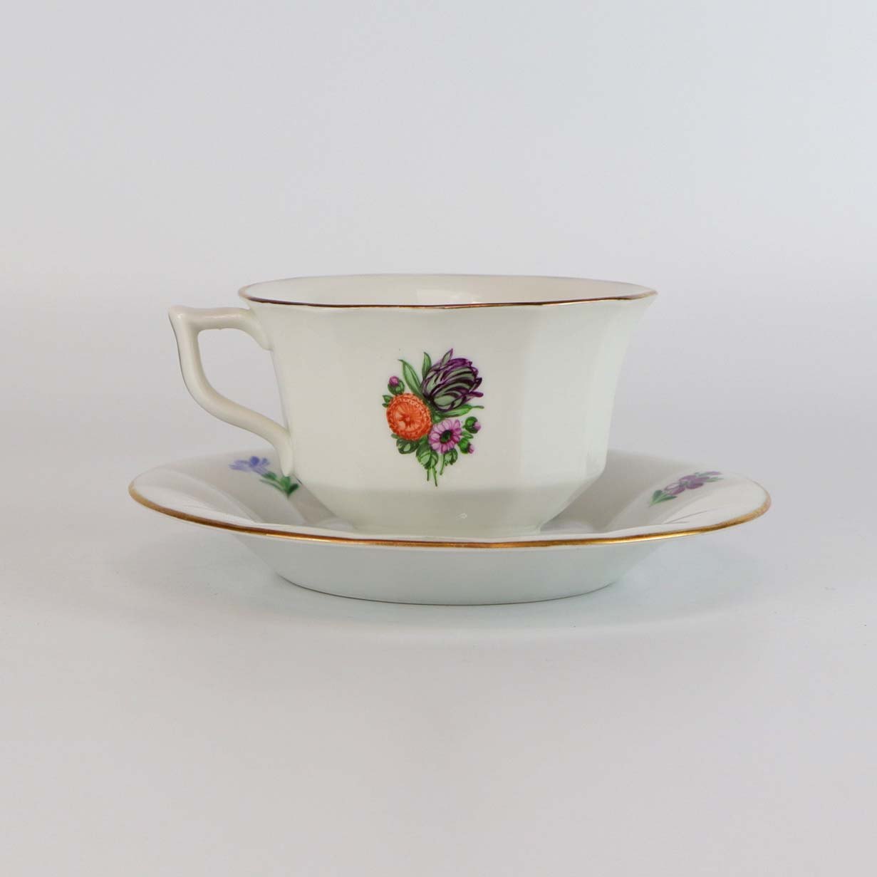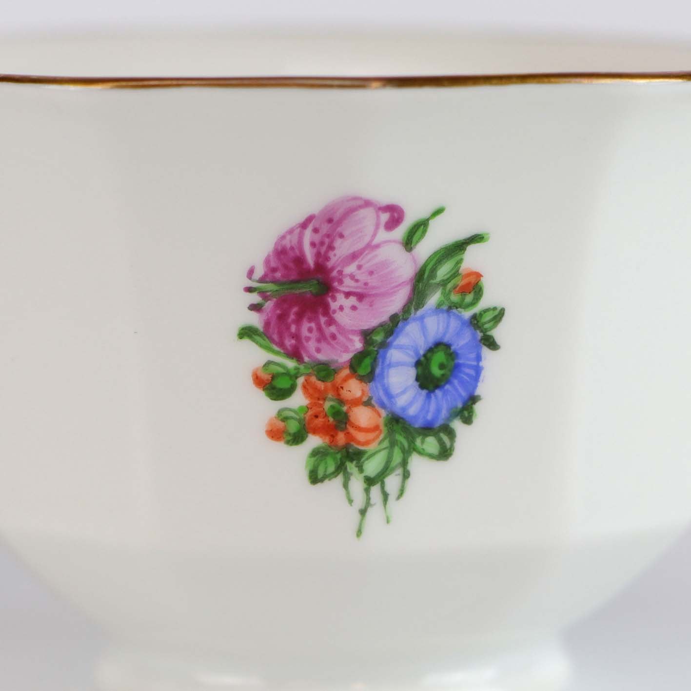 Sæt i glat kantet hvidt porcelæn med faverige motiver af blomster og guldkant