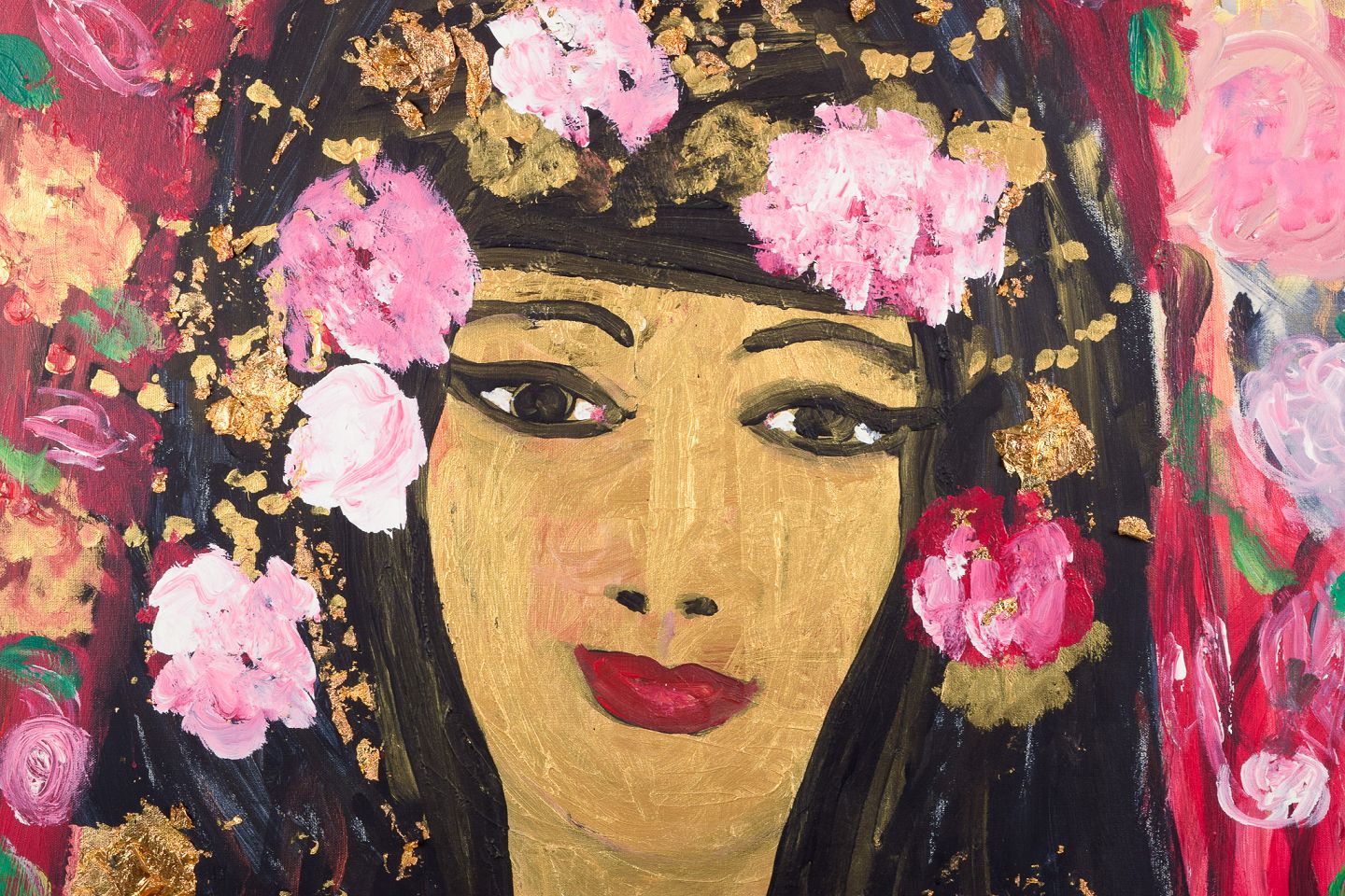 Ung kvinde med blomster i håret. Bladguld i hår.