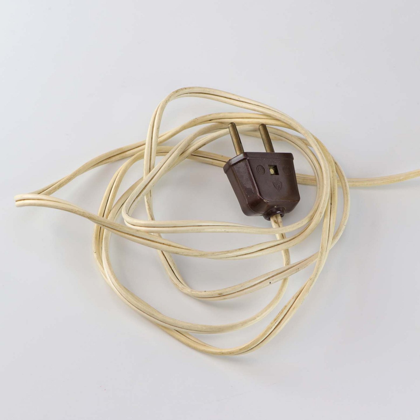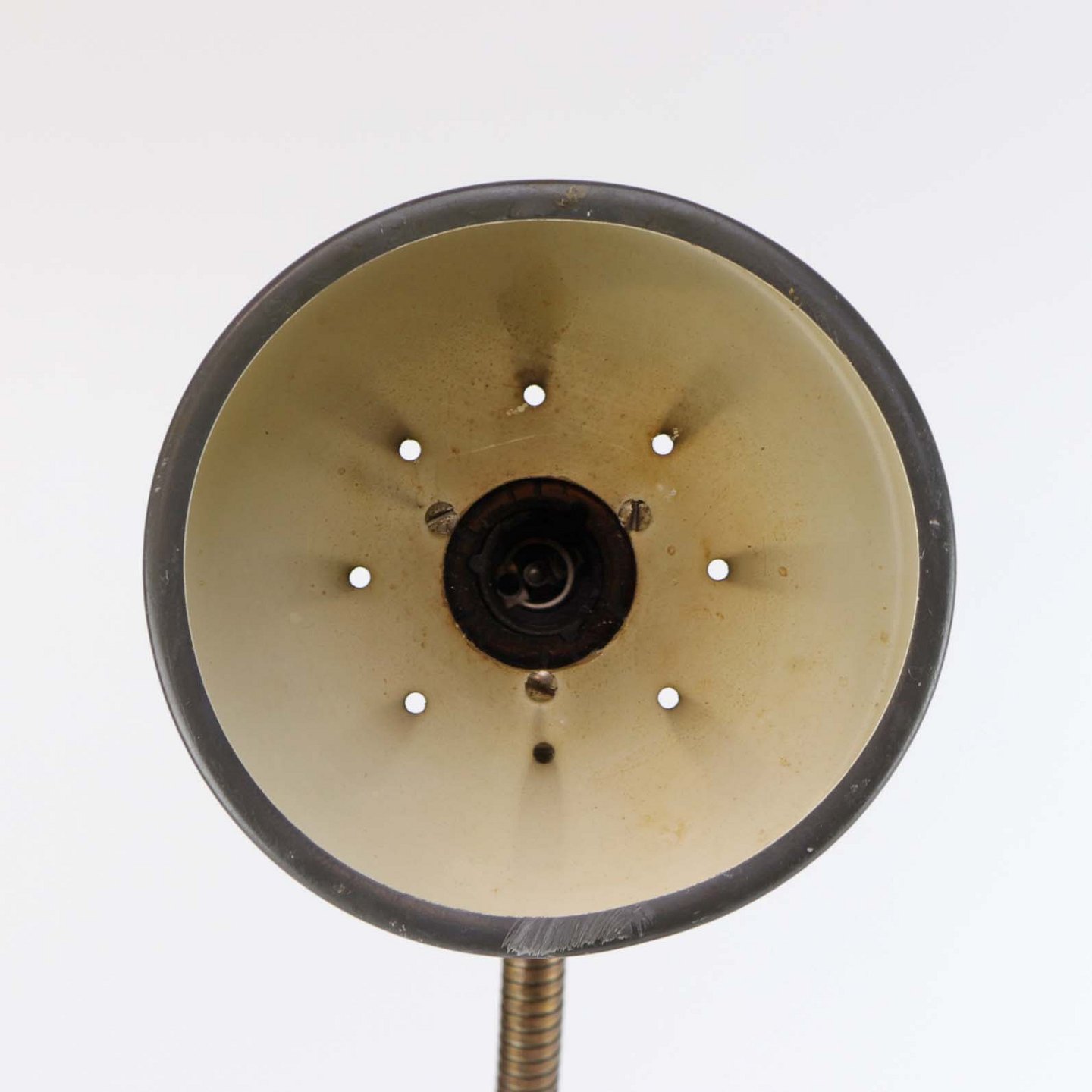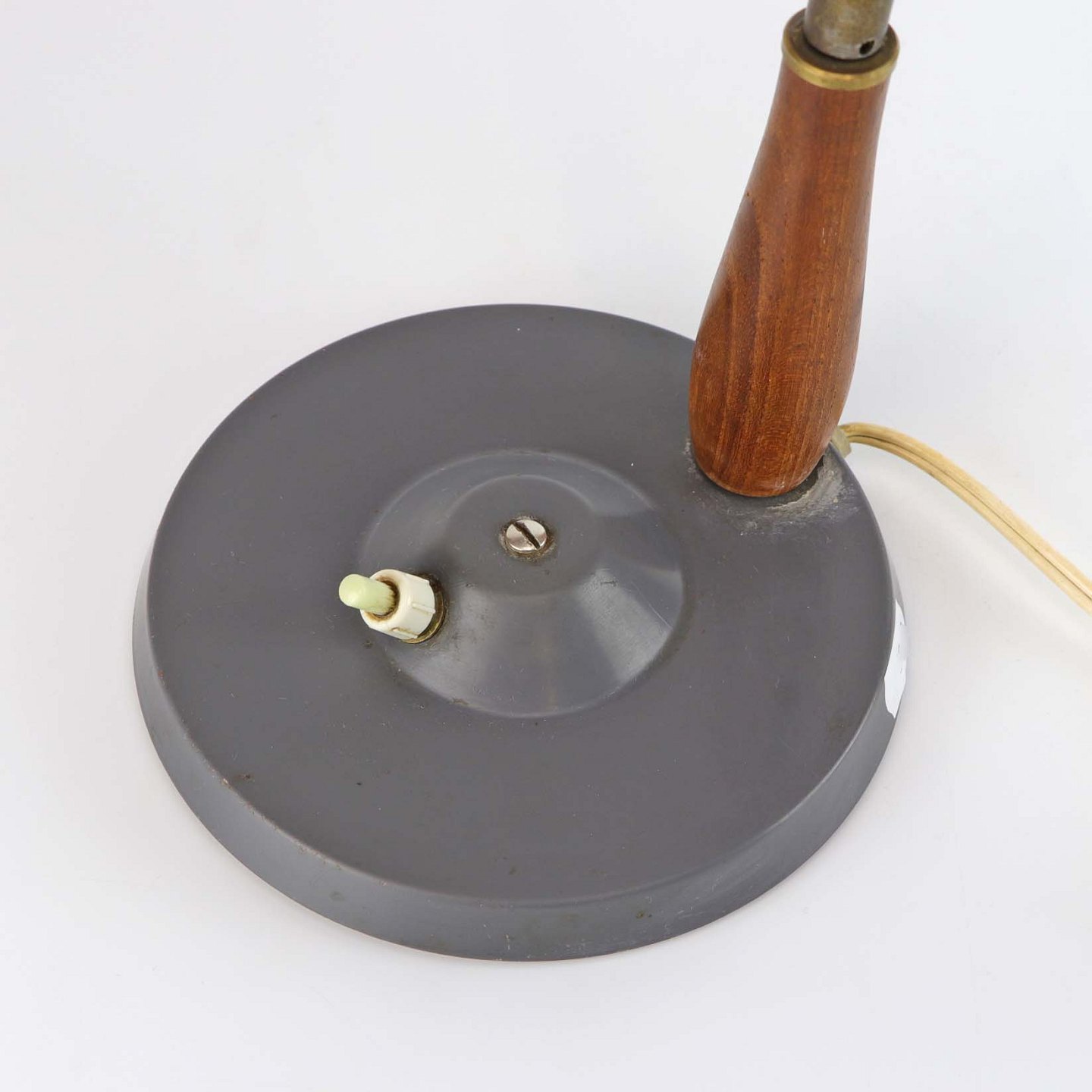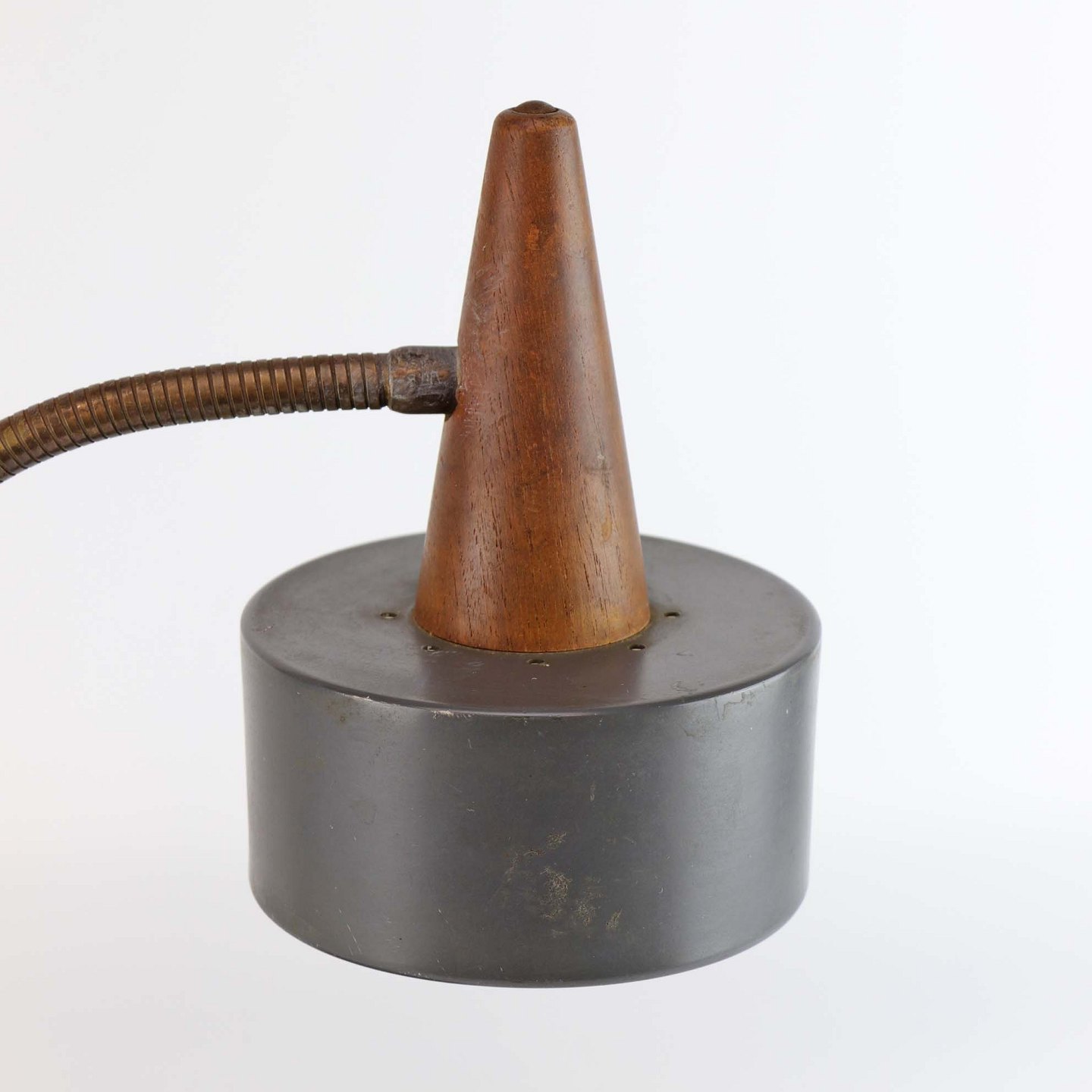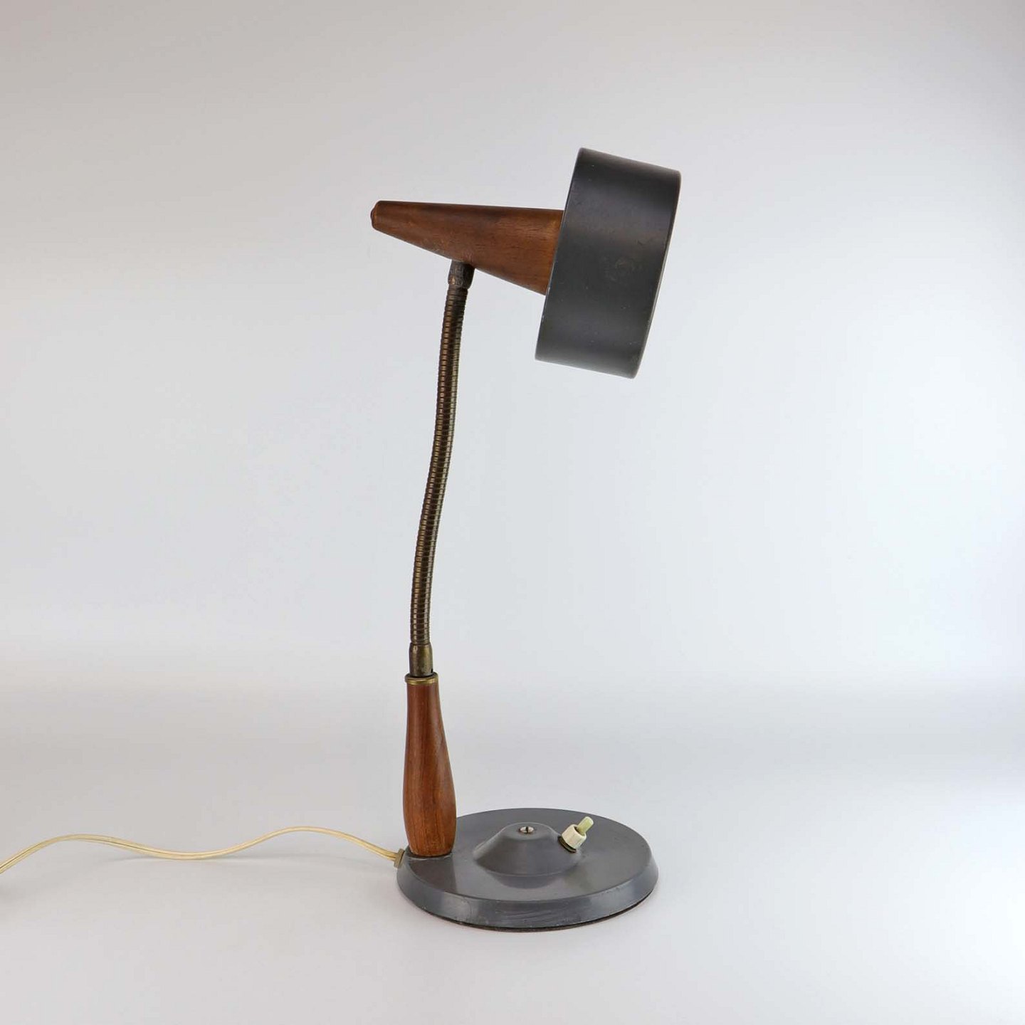 Bordlampe med flexarm i gråmalet metal og teaktræ