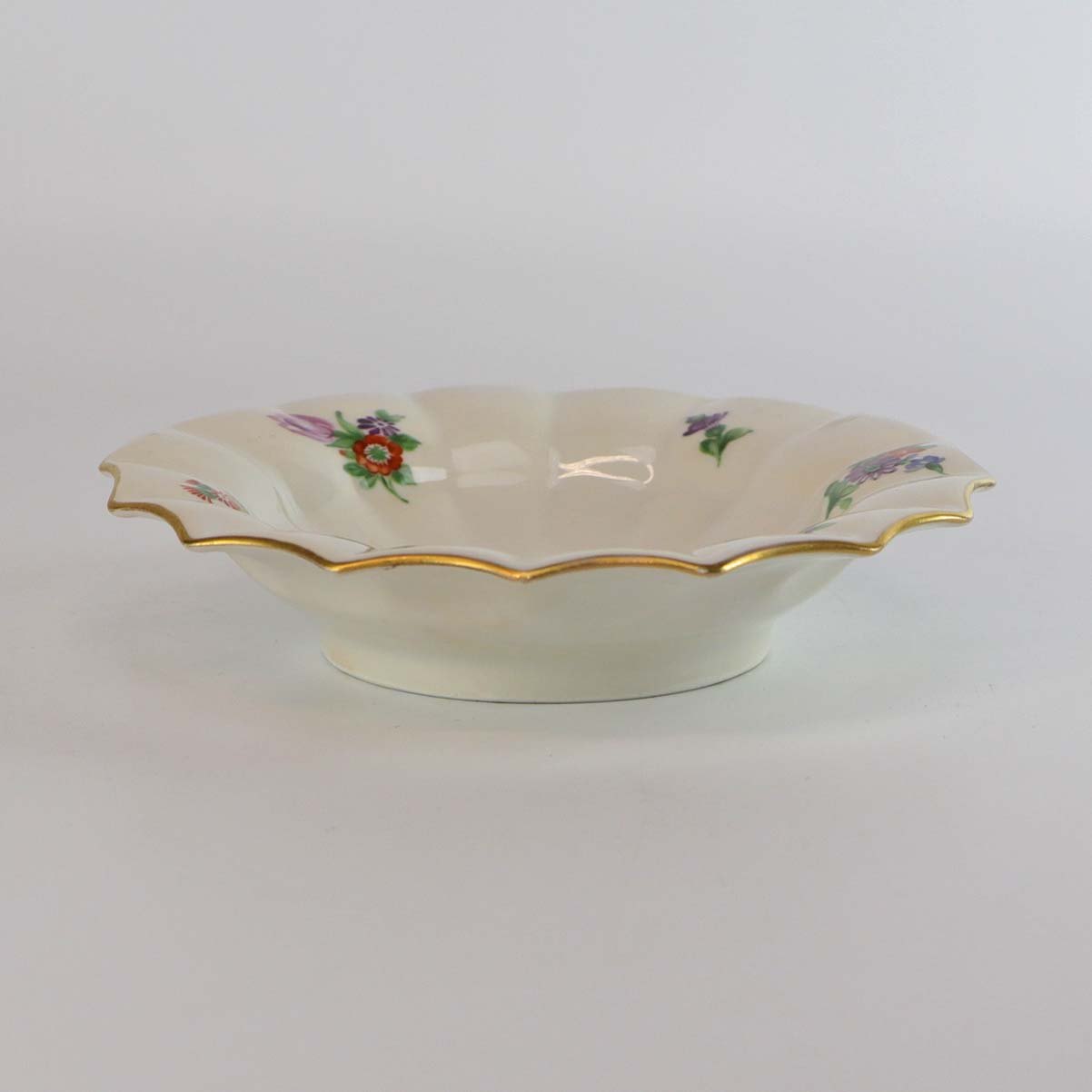 Skål i glat kantet hvidt porcelæn med faverige motiver af blomster og guldkant