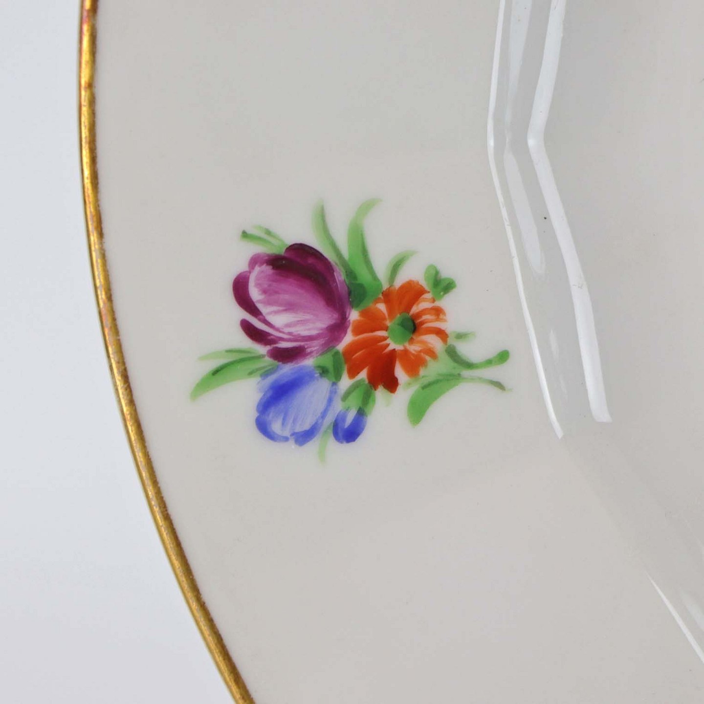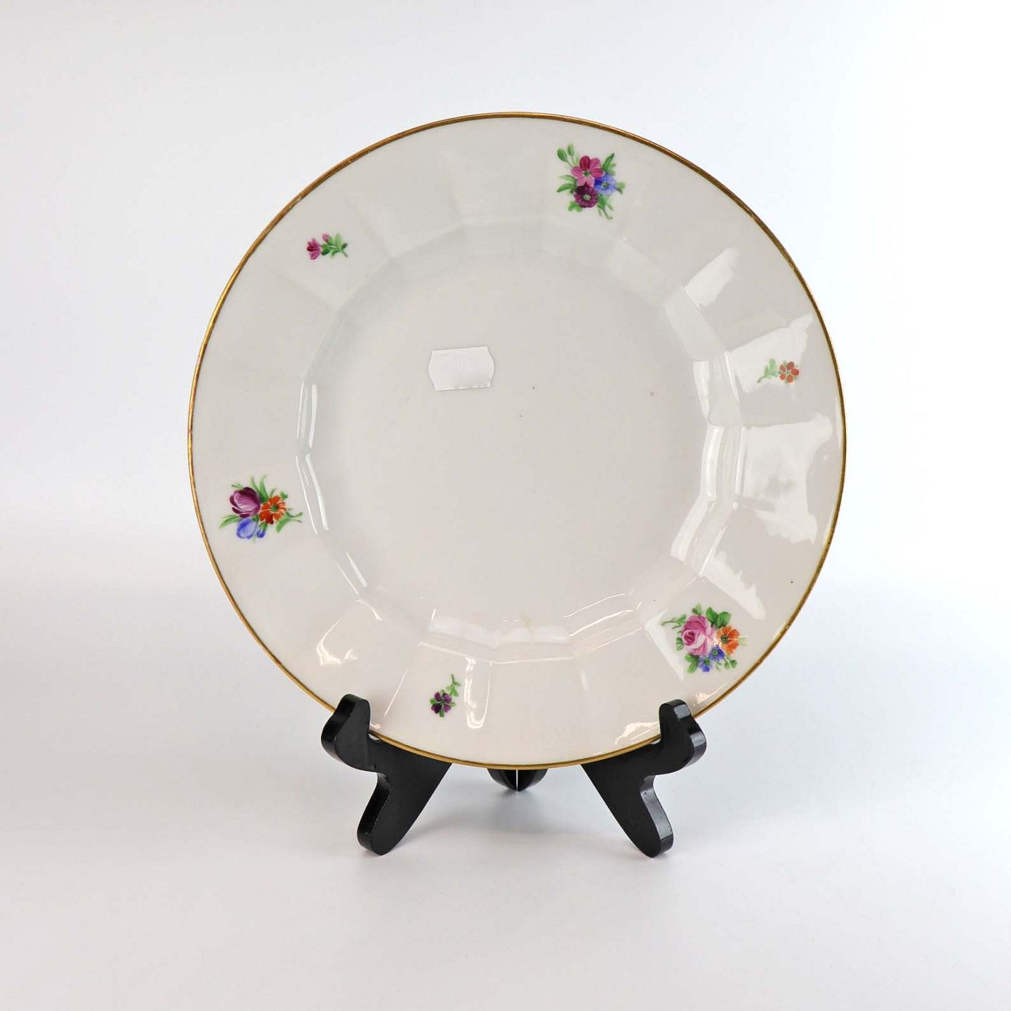 Tallerken i glat kantet hvidt porcelæn med faverige motiver af blomster og guldkant