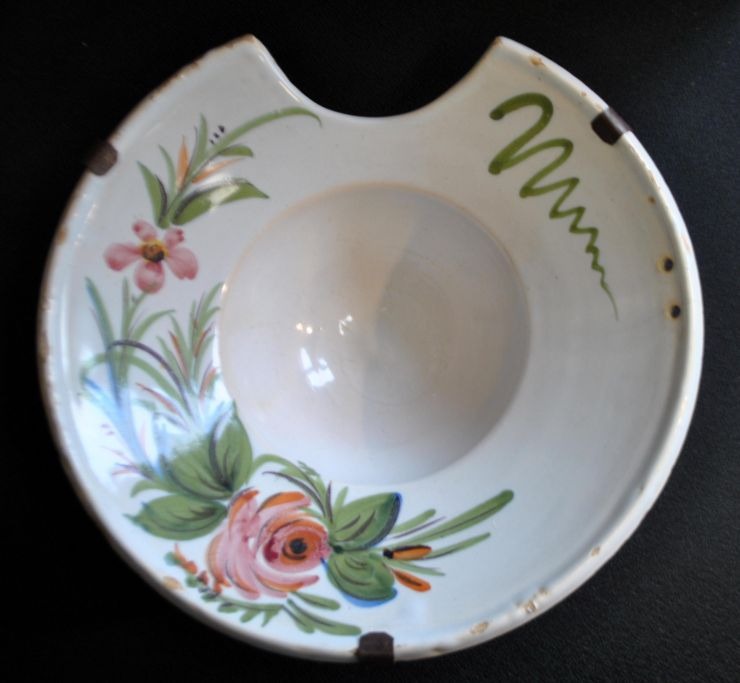 French faience barber dish, 19th century With polychrome decoration with flowers. Height: 10 cm. Dia.: 27 cm.