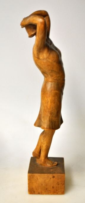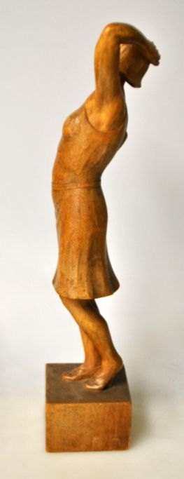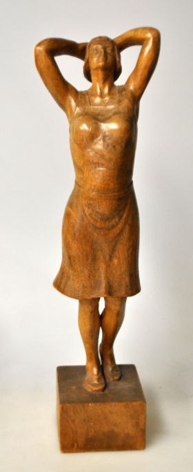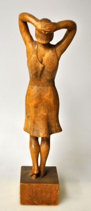 Danish artist (20th century): Standing woman. Carved wooden figure. Signed. H.: 26 cm.
