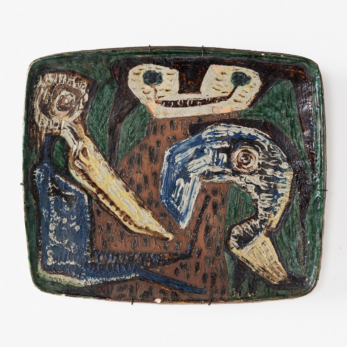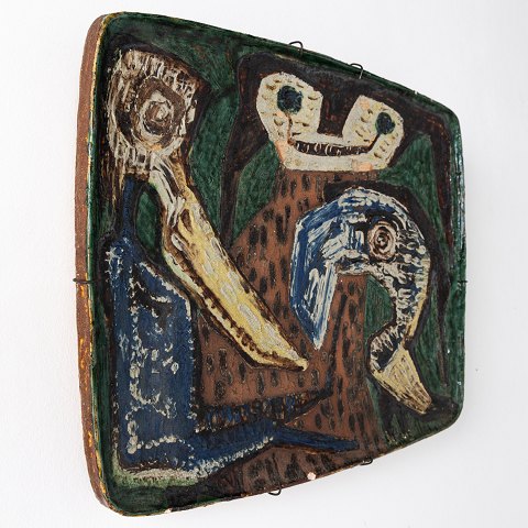 Relief i stentøj i polykrome farver. Signeret fra 1960.