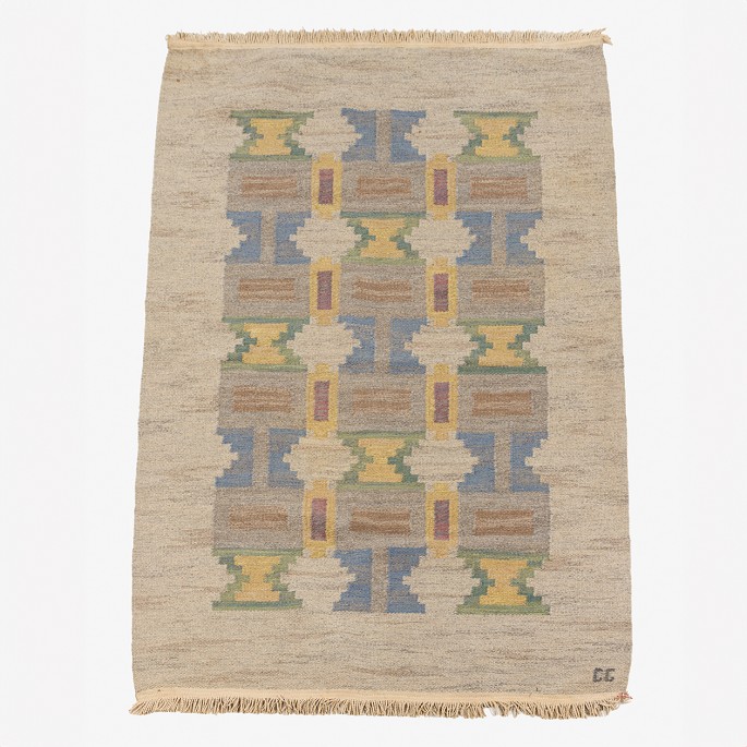 Tæppe i uld, håndvævet 'rölakan'-teknik og polykromt, i et geometrisk mønster.
