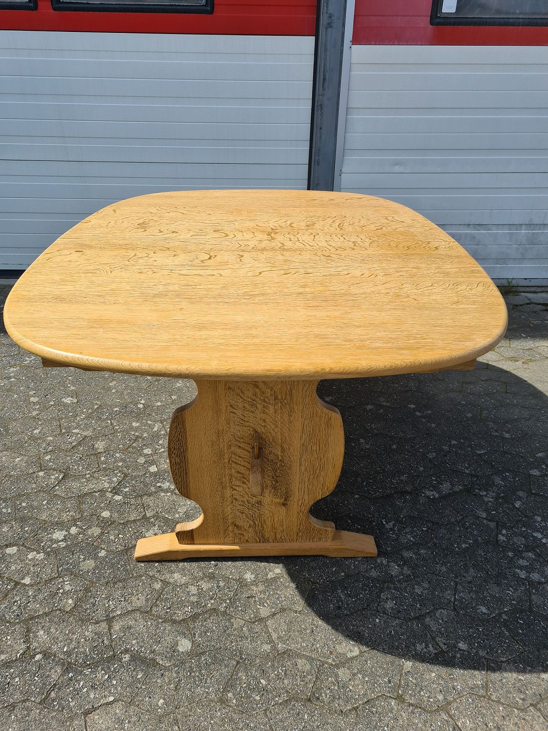 Spisebord i massivt egetræ med 2 tillægsplader, fra 1980erne.