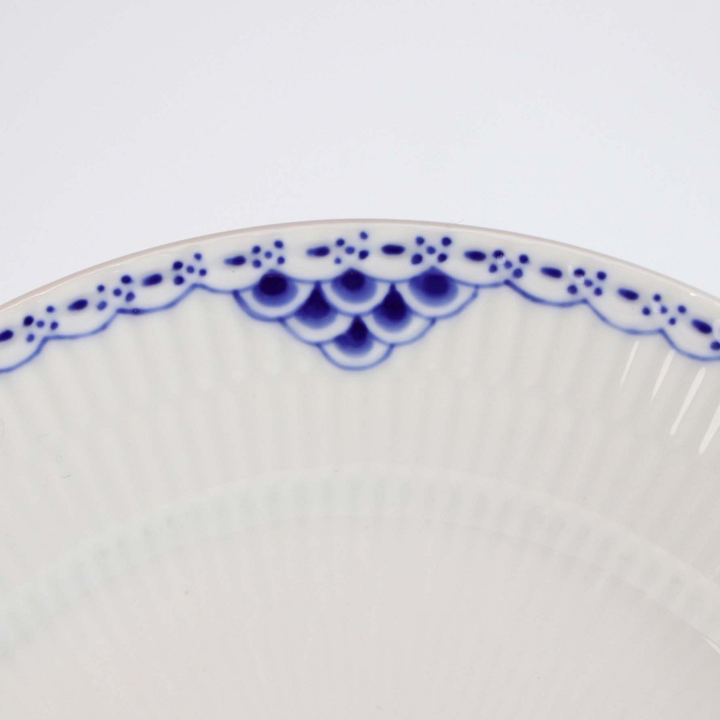 Stellet er fremstillet i riflet hvidt porcelæn med blåmalet blonder og fiskeskældsdekoration