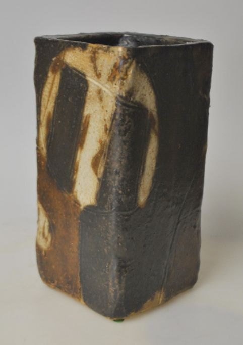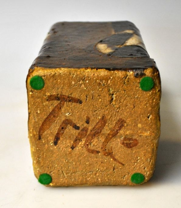 Jørgensen, Trille (1944 - ) Danmark: Vase i stentøj. Dekoreret med brune og sorte glasurer. Signeret i bunden: trille. H: 18 cm. B: 9 x 9 cm.
