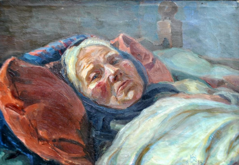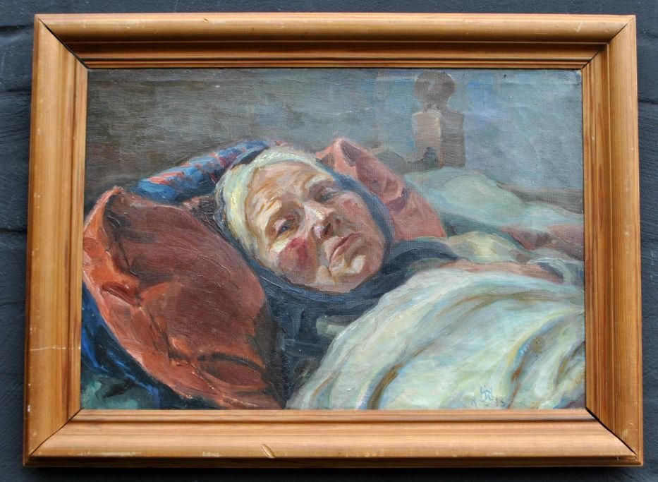 Hedegaard, Jens Rasmussen (1866 - 1948) Danmark: Sofie Hedegaard i en seng. Olie på lærred. Signeret august 1913. 32 x 47 cm.