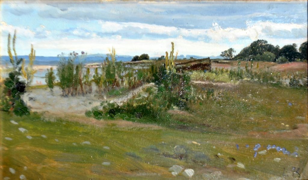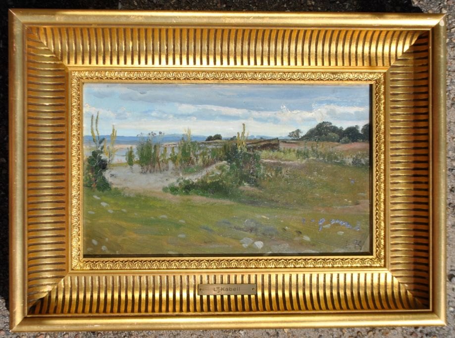 Kabell, Ludvig (1853 - 1902) Danmark: Landskab ved kysten. Olie på lærred. Signeret. 19,5 x 31 cm.