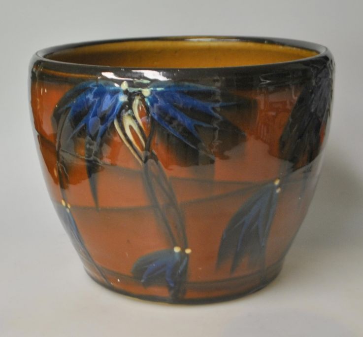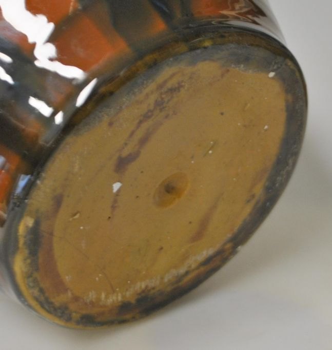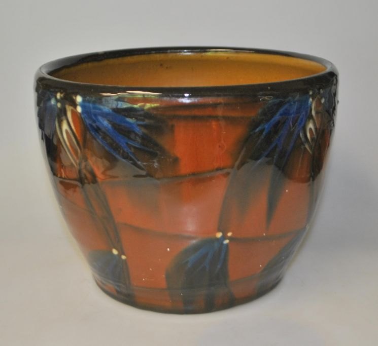 Dansk keramiker (20. årh): Urtepotte skjuler. Glaseret lertøj. Glasur i brune, blå, gule og sorte farver. Usigneret. H.: 16 cm. Dia.: 21 cm.