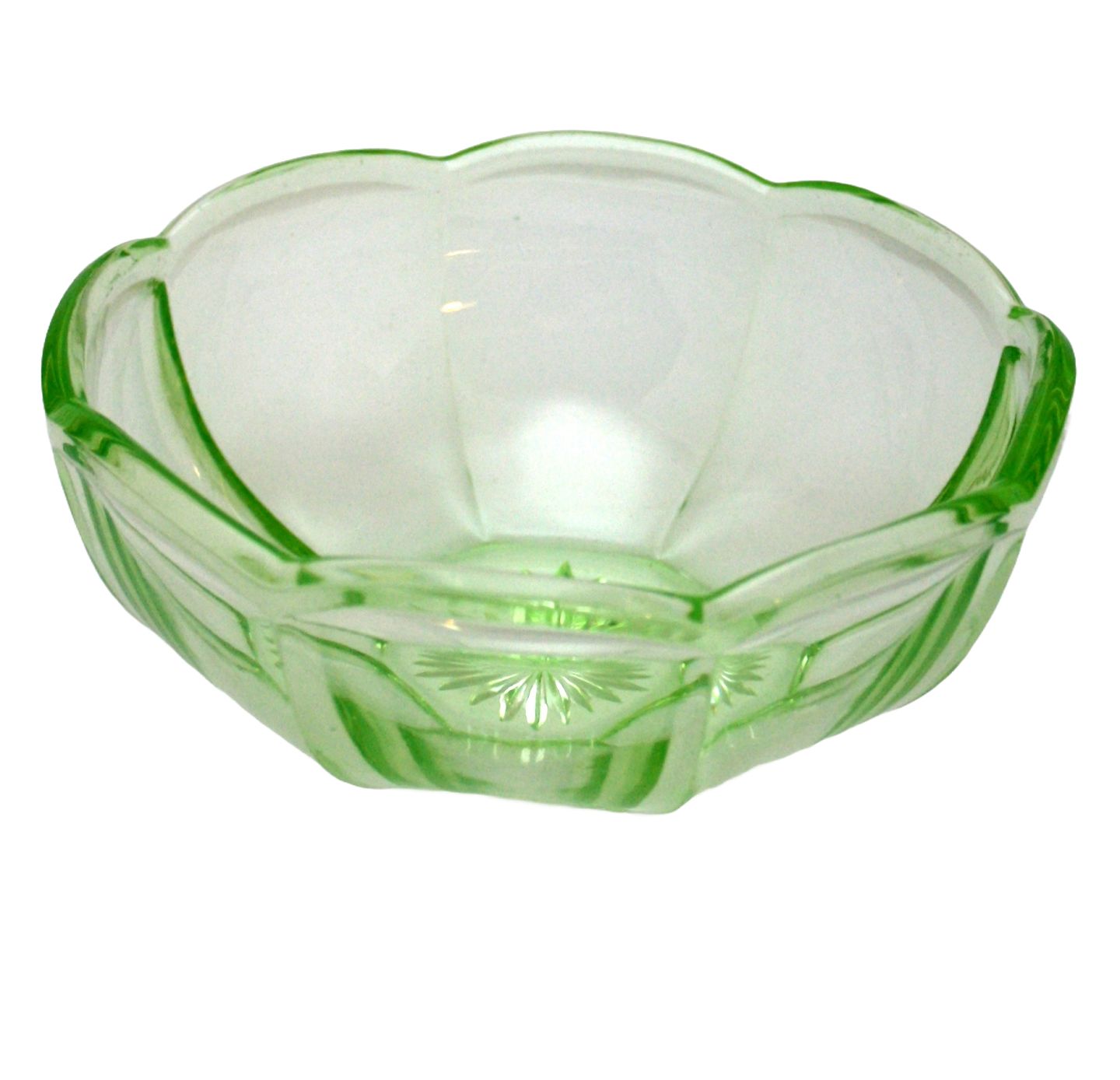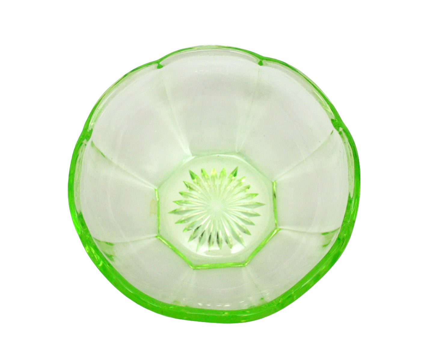 Fyens Glasværk, Chippendale, urangrøn eller neon lille skål i presset glas. Produceret fra 1934 og frem. Højde 6 cm. Diameter 15 cm. Pris: 200 kr. stk. Lager: 1