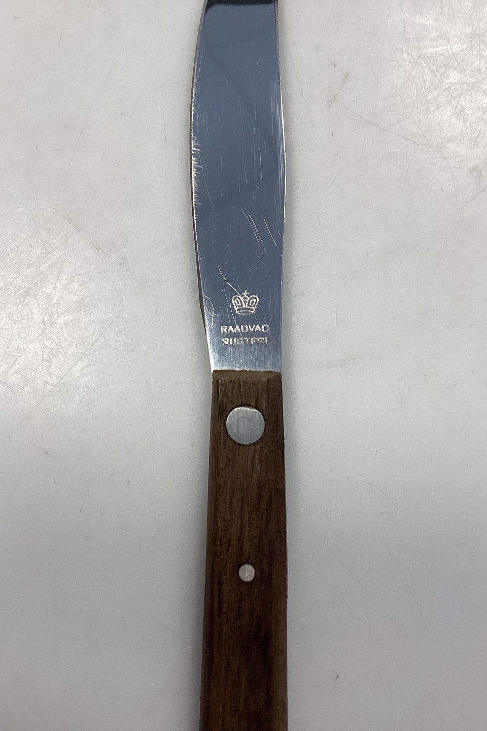 Raadvad Rustfri Spisekniv med mørkebrunt træhåndtag. I god stand.
