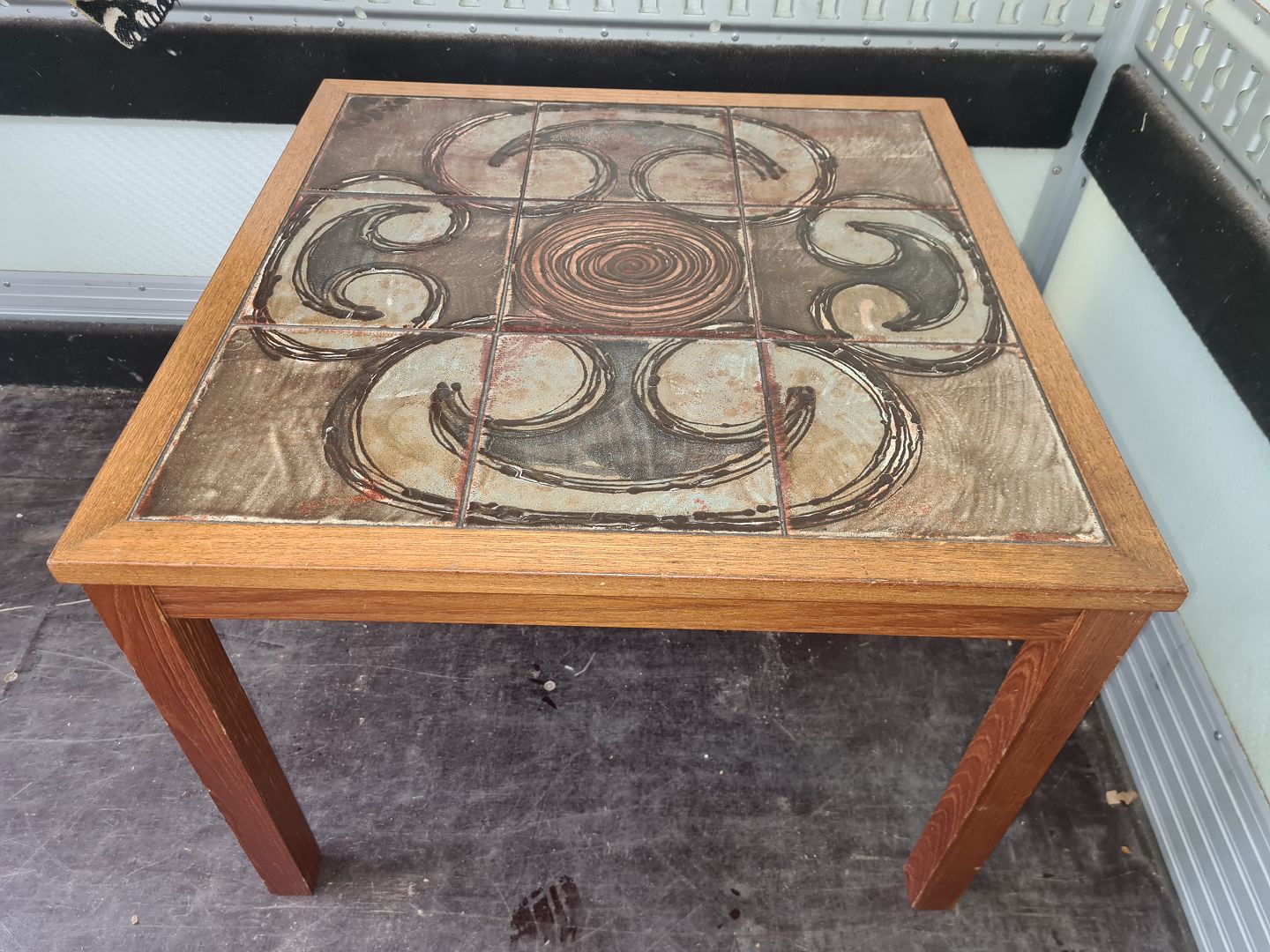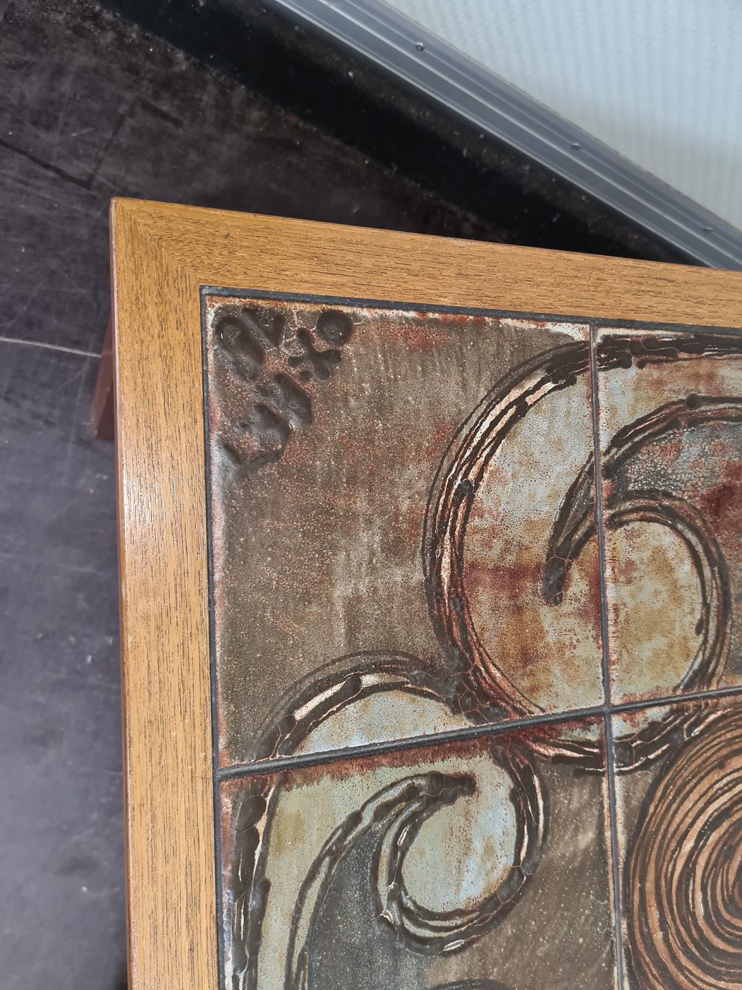 Sofabord fra 1970´erne i eg og med kakler. Bordet fremstår godt og stabilt dog med en lille flænge i en af kaklerne. (billede)