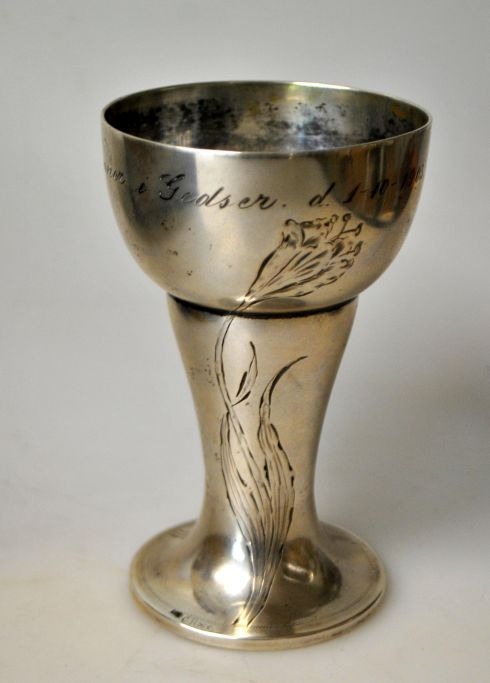 Jugend sølv bæger, udarbejdet af C. Rose, 1903. Danmark. Med indgraverede dekorationer med blomster. Stemplet. H.:10,4 cm.