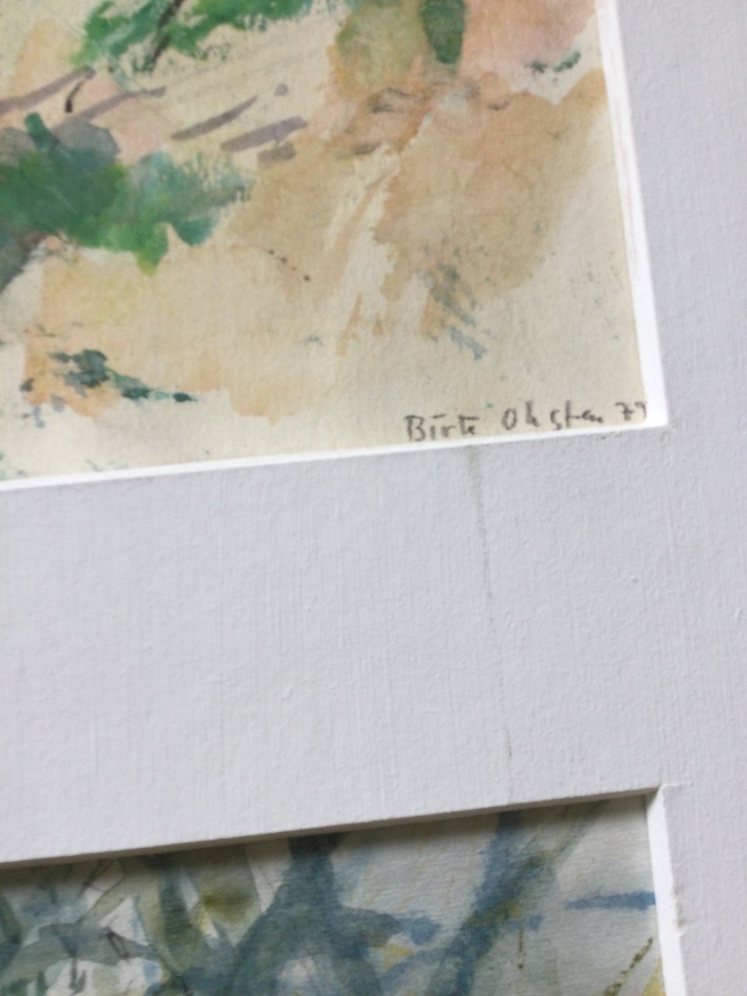 2 akvareller indrammet med passepartout i samme ramme uden glas.