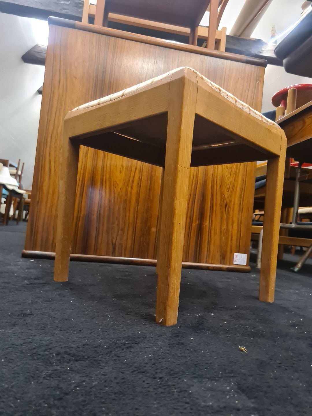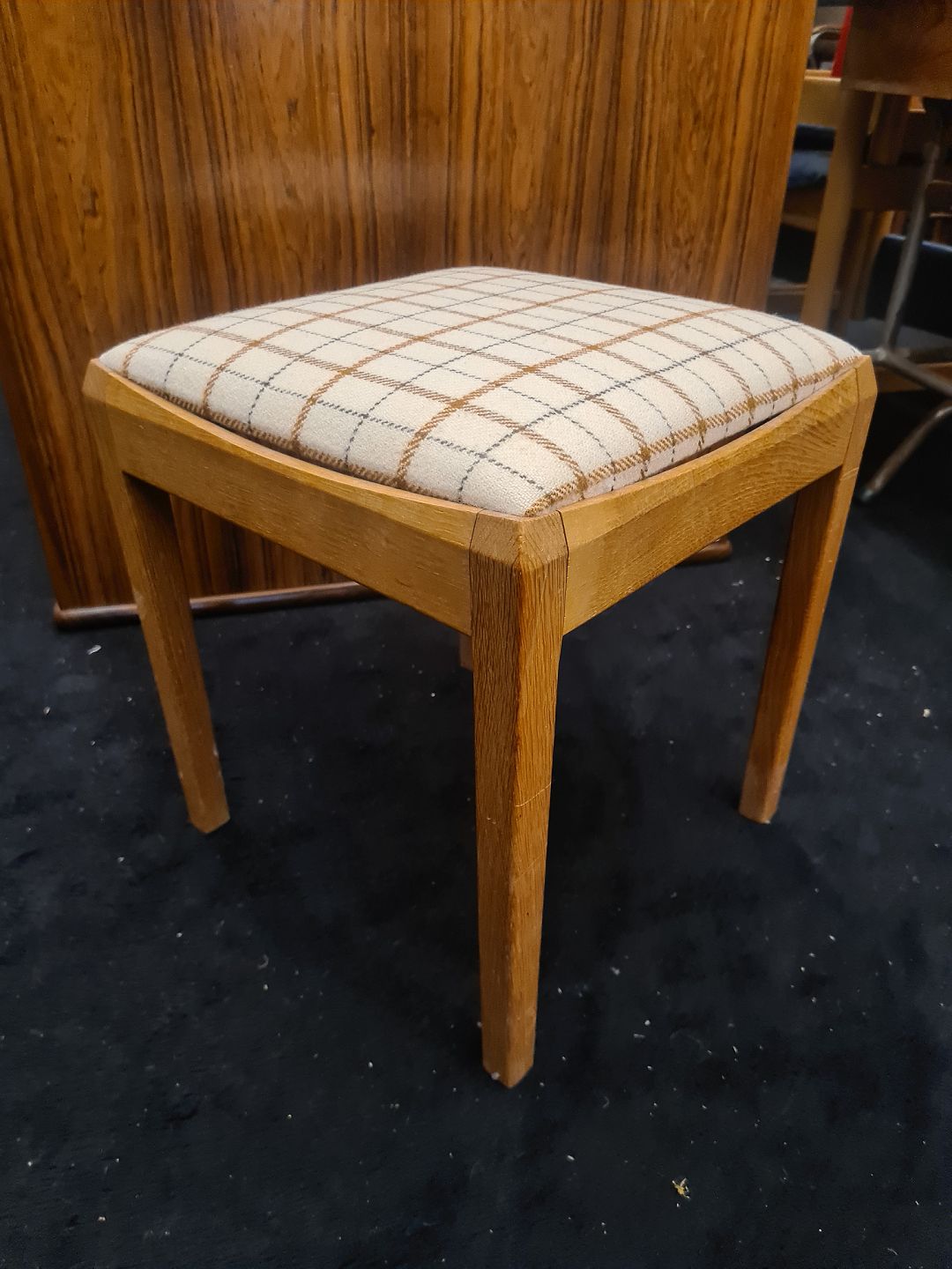 Taburet fra 1970´erne i eg med uldpolstring. Fremstår pæn og velholdt uden nævneværdige brugsspor.